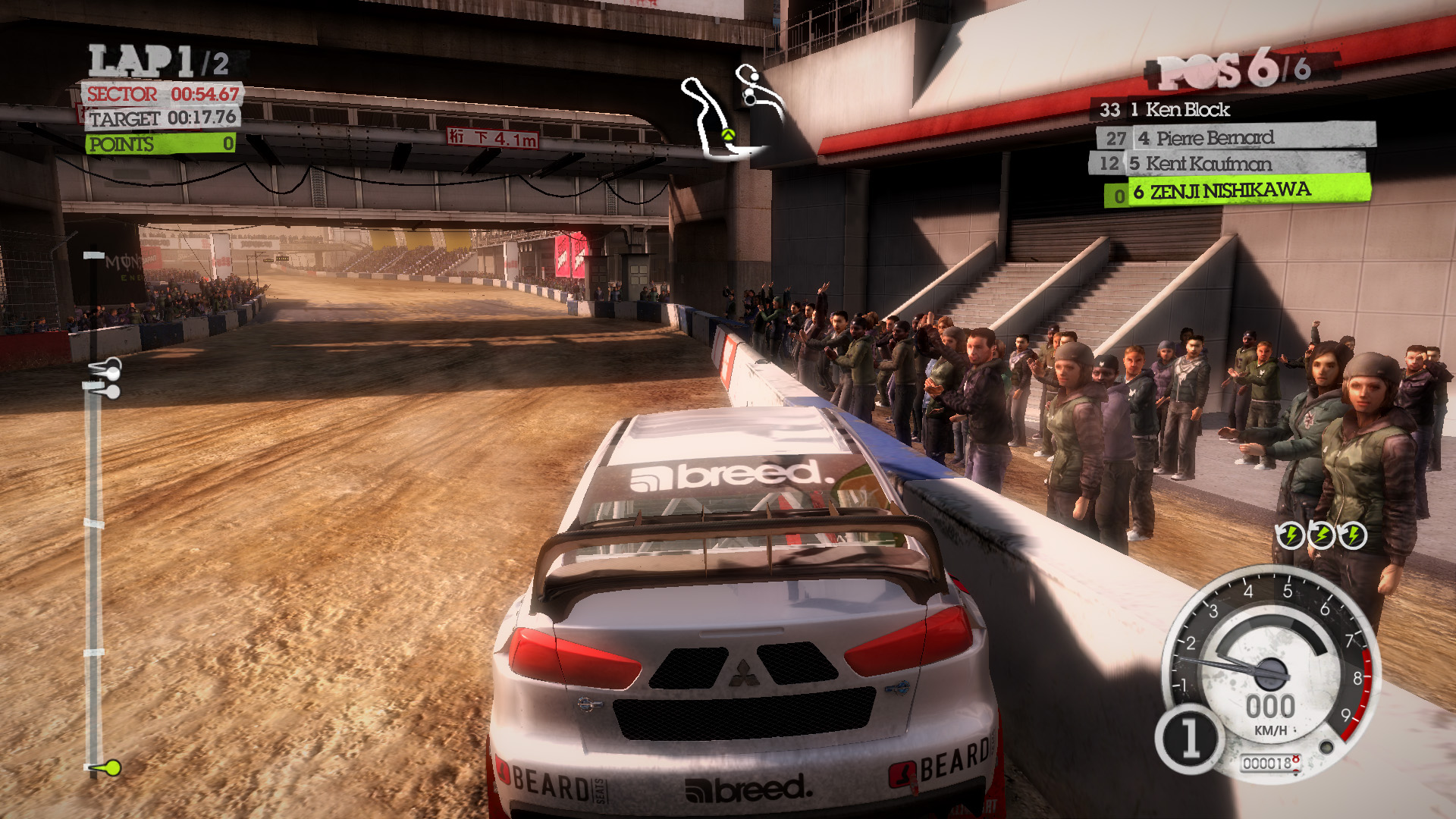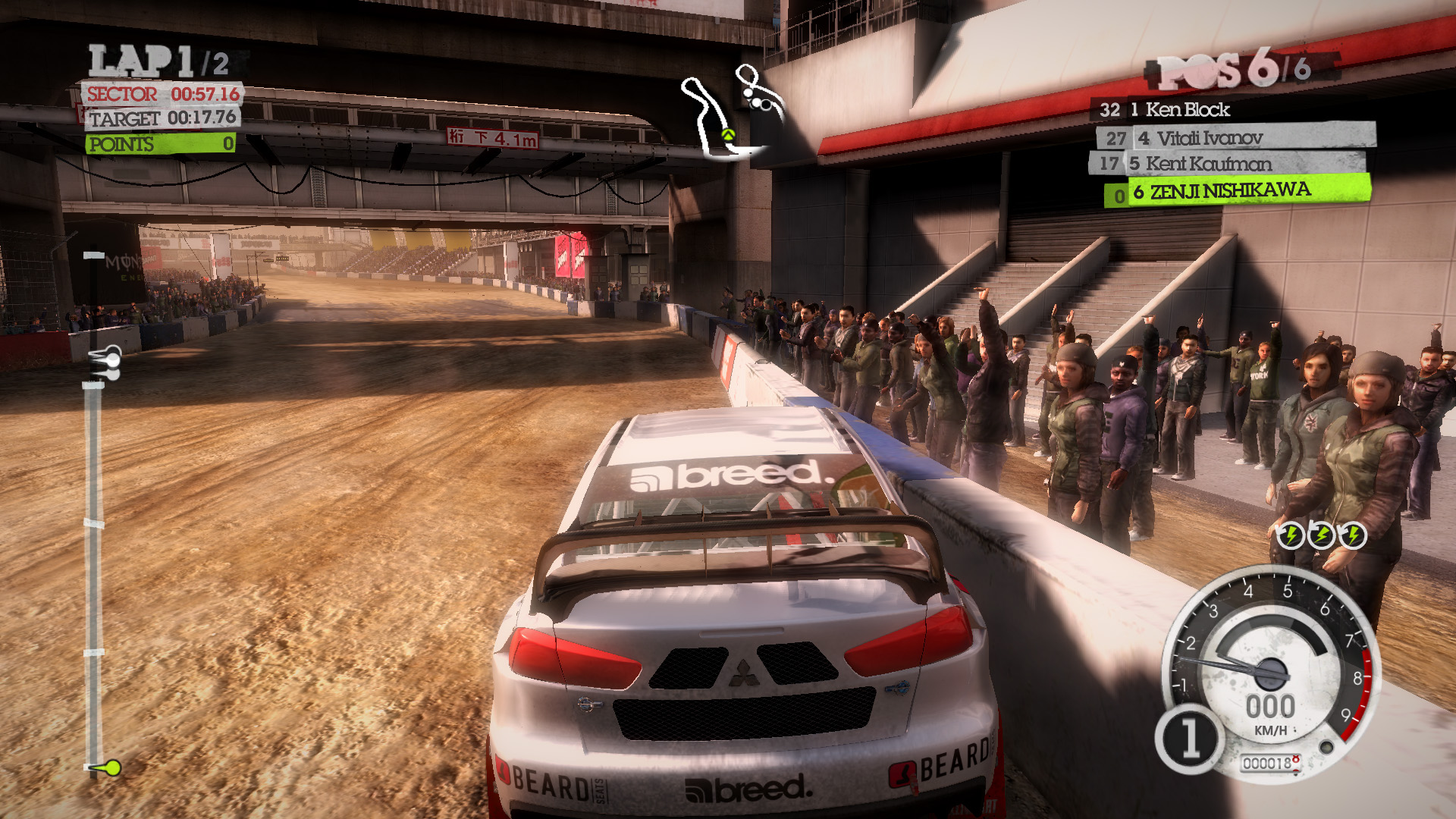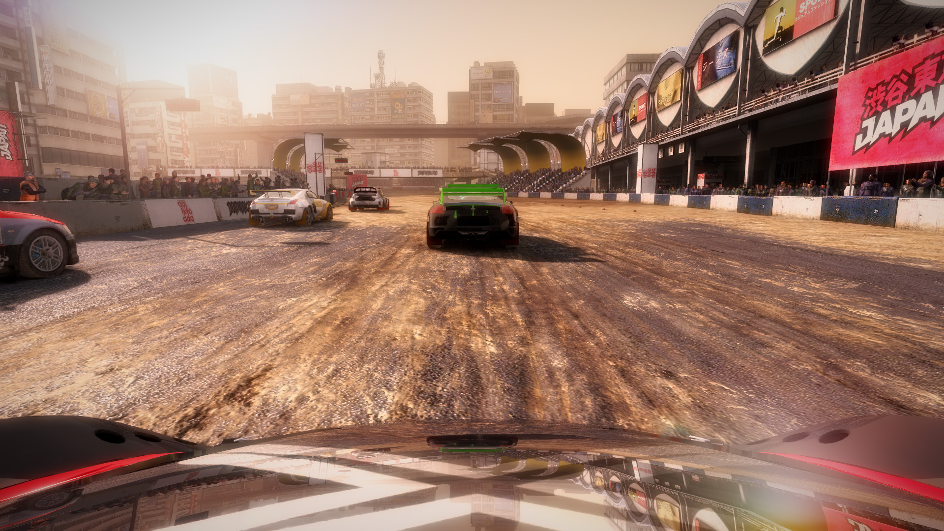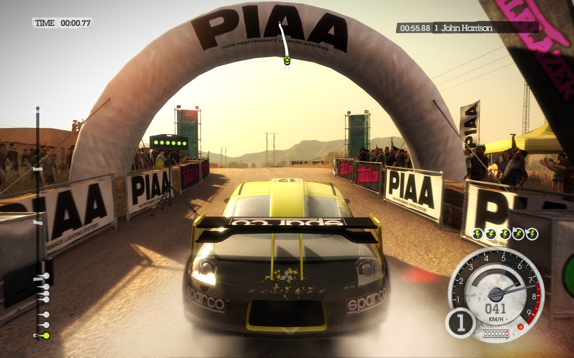 DiRT 2の影生成は,あまり高度なものではないようで,最高位設定のHIGHでも,光源が遠い影には強いジャギーが出る。さらに群衆については,どのような設定でも影生成は行われない。