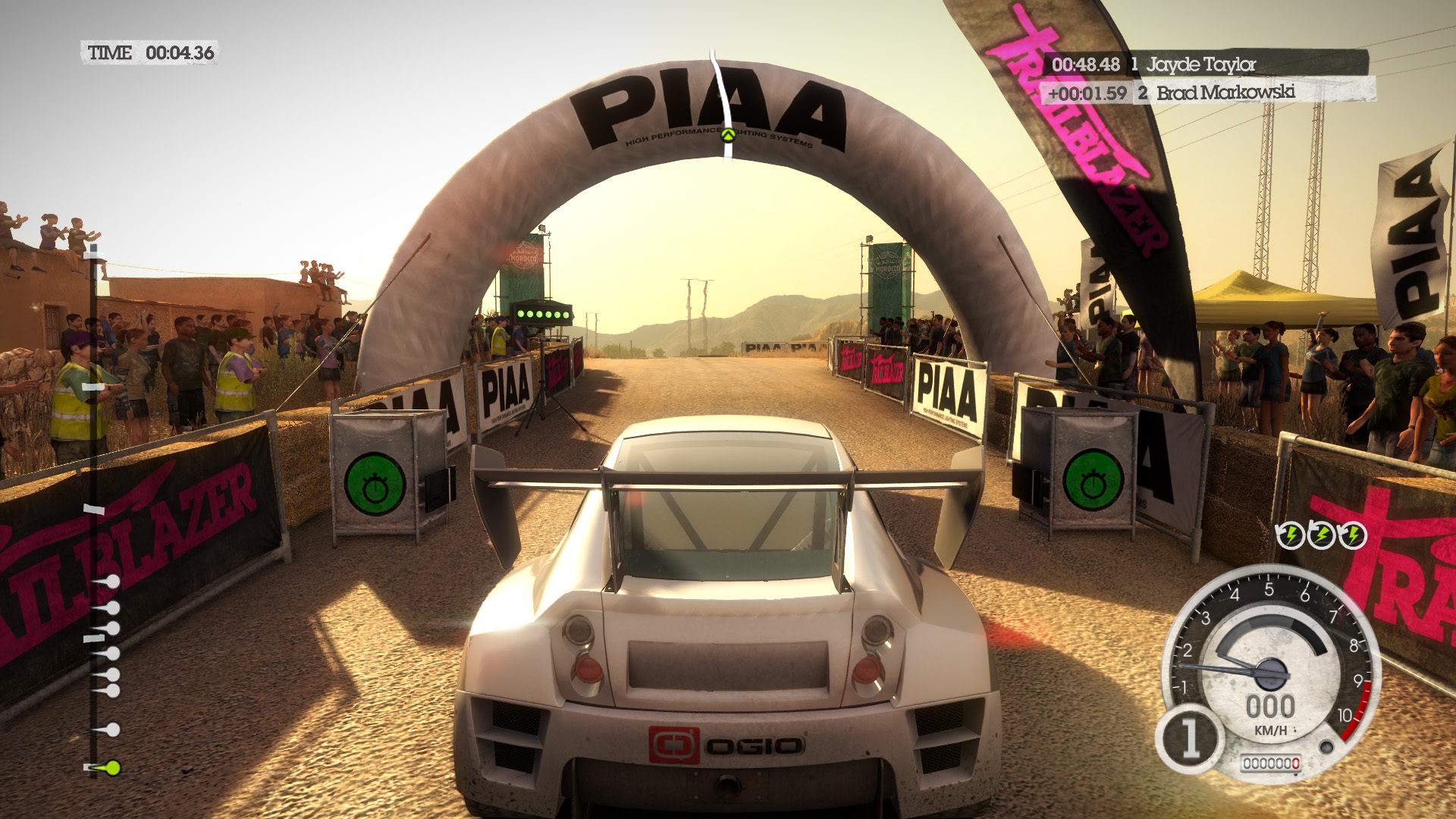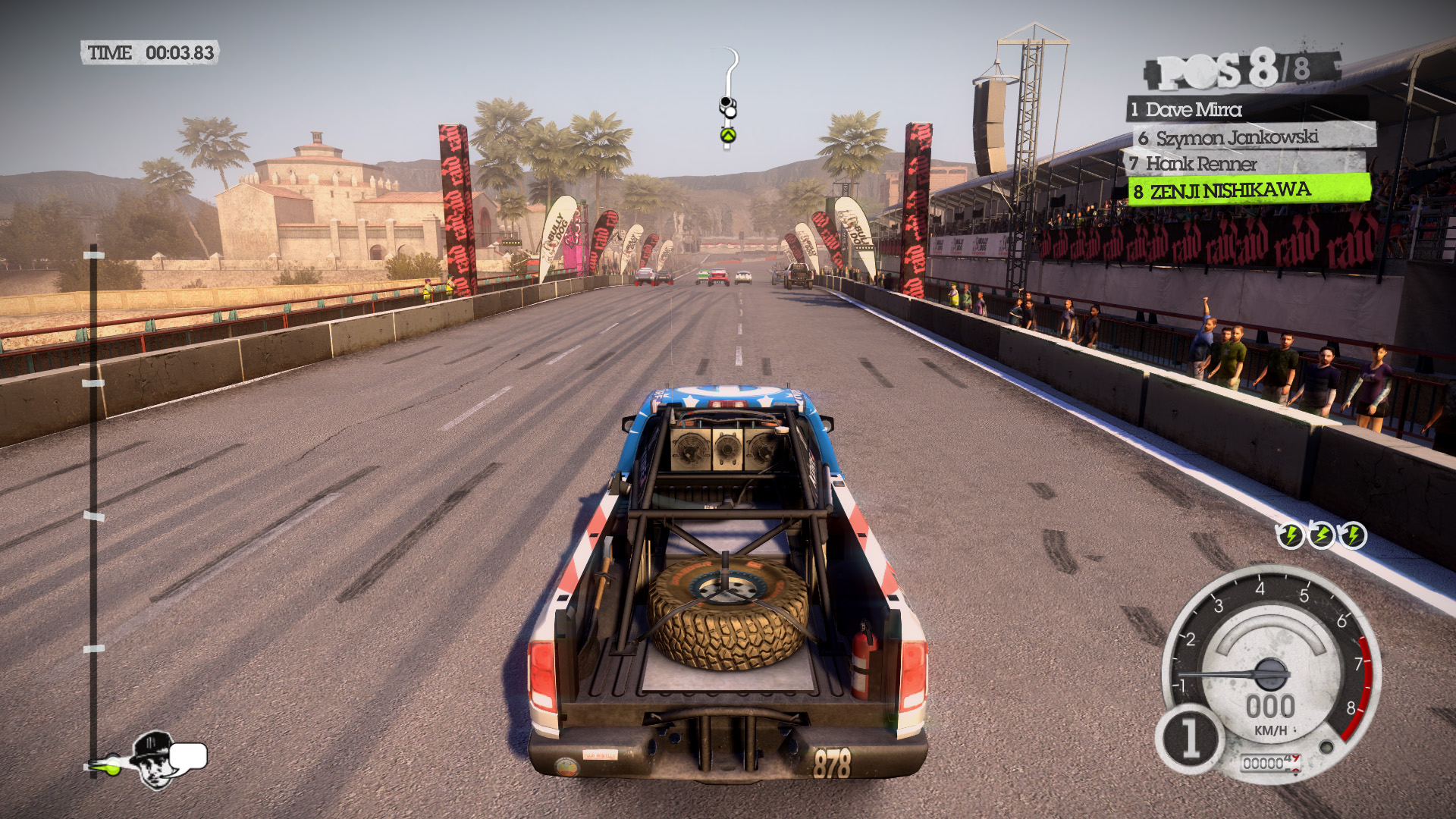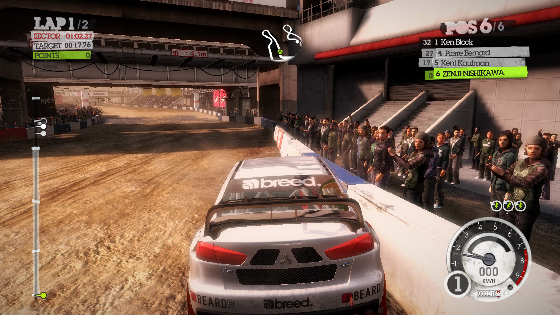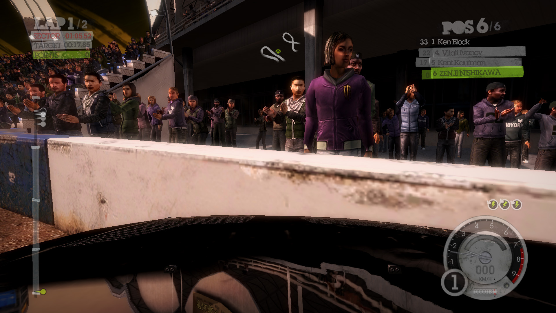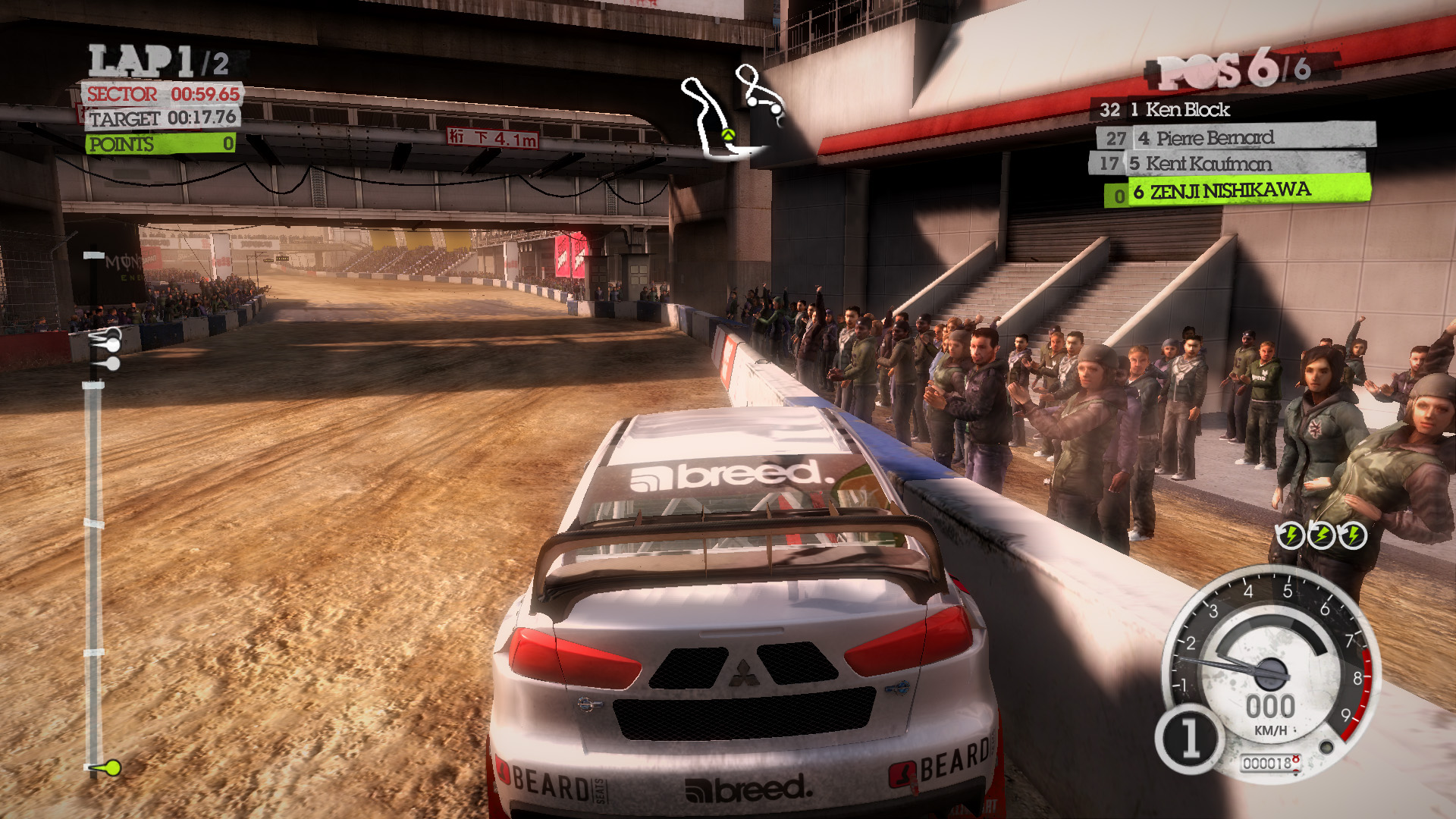 DiRT 2の影生成は,あまり高度なものではないようで,最高位設定のHIGHでも,光源が遠い影には強いジャギーが出る。さらに群衆については,どのような設定でも影生成は行われない。