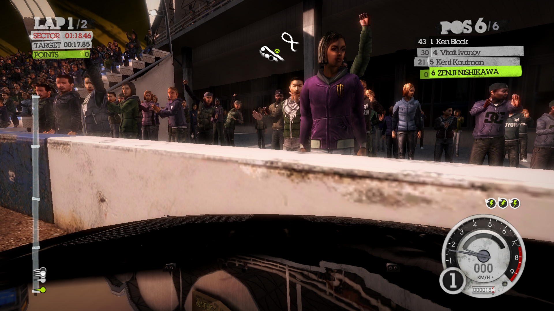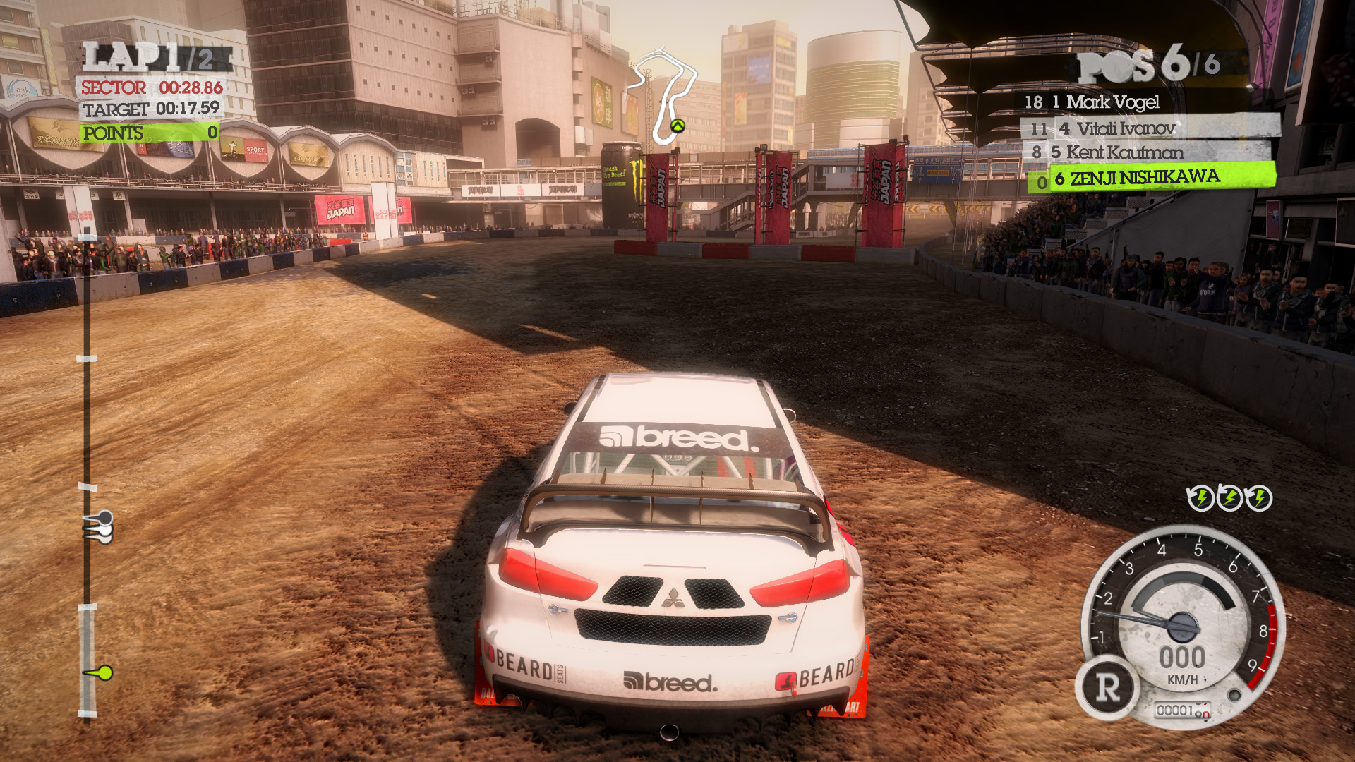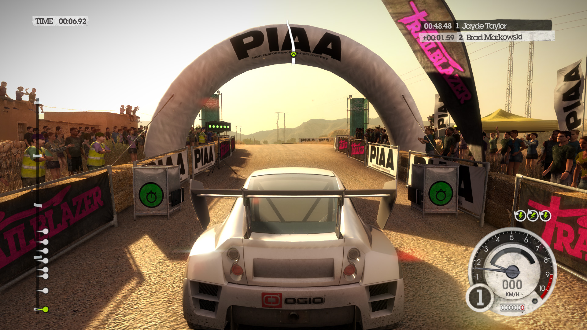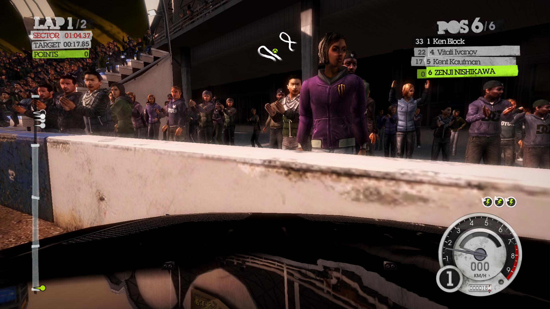 DiRT 2の影生成は,あまり高度なものではないようで,最高位設定のHIGHでも,光源が遠い影には強いジャギーが出る。さらに群衆については,どのような設定でも影生成は行われない。