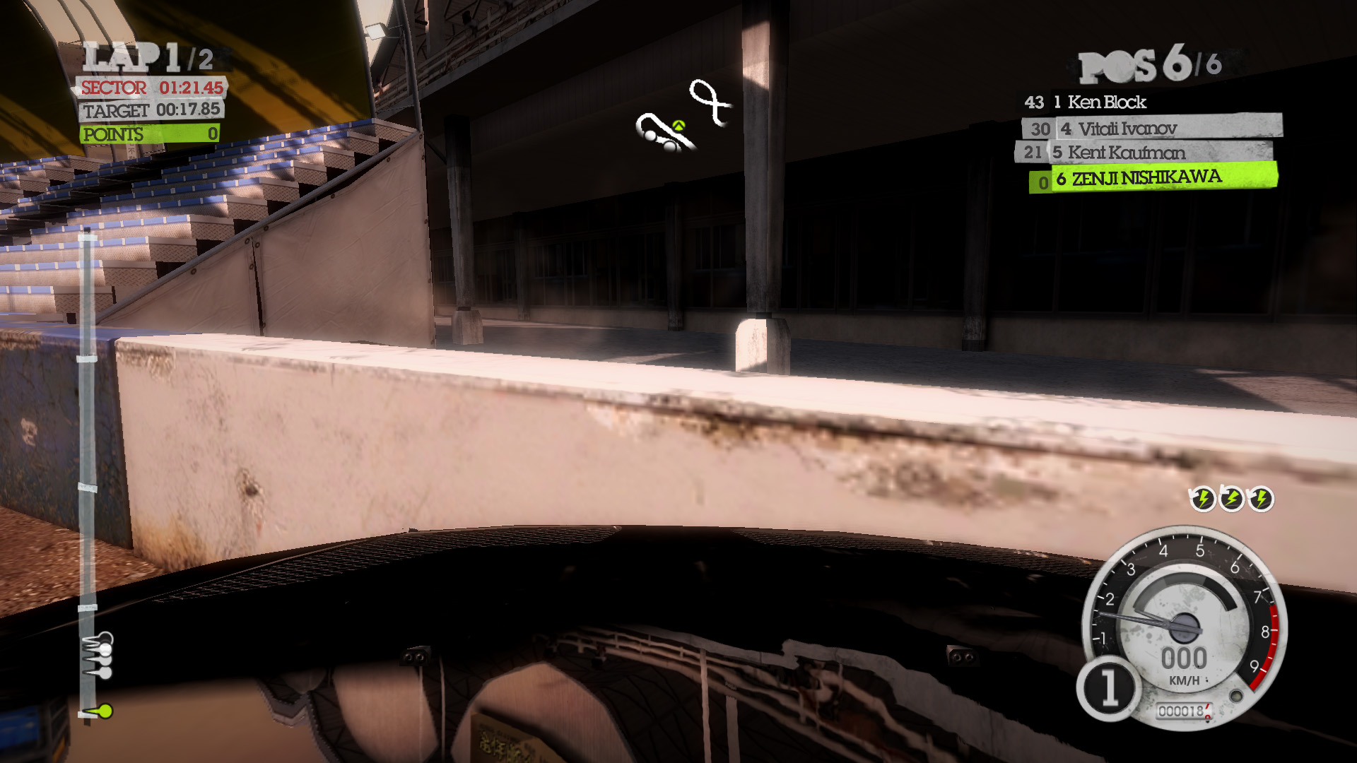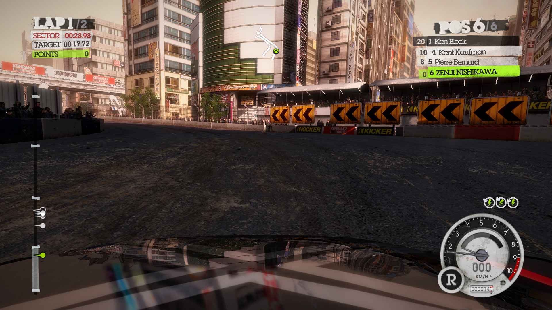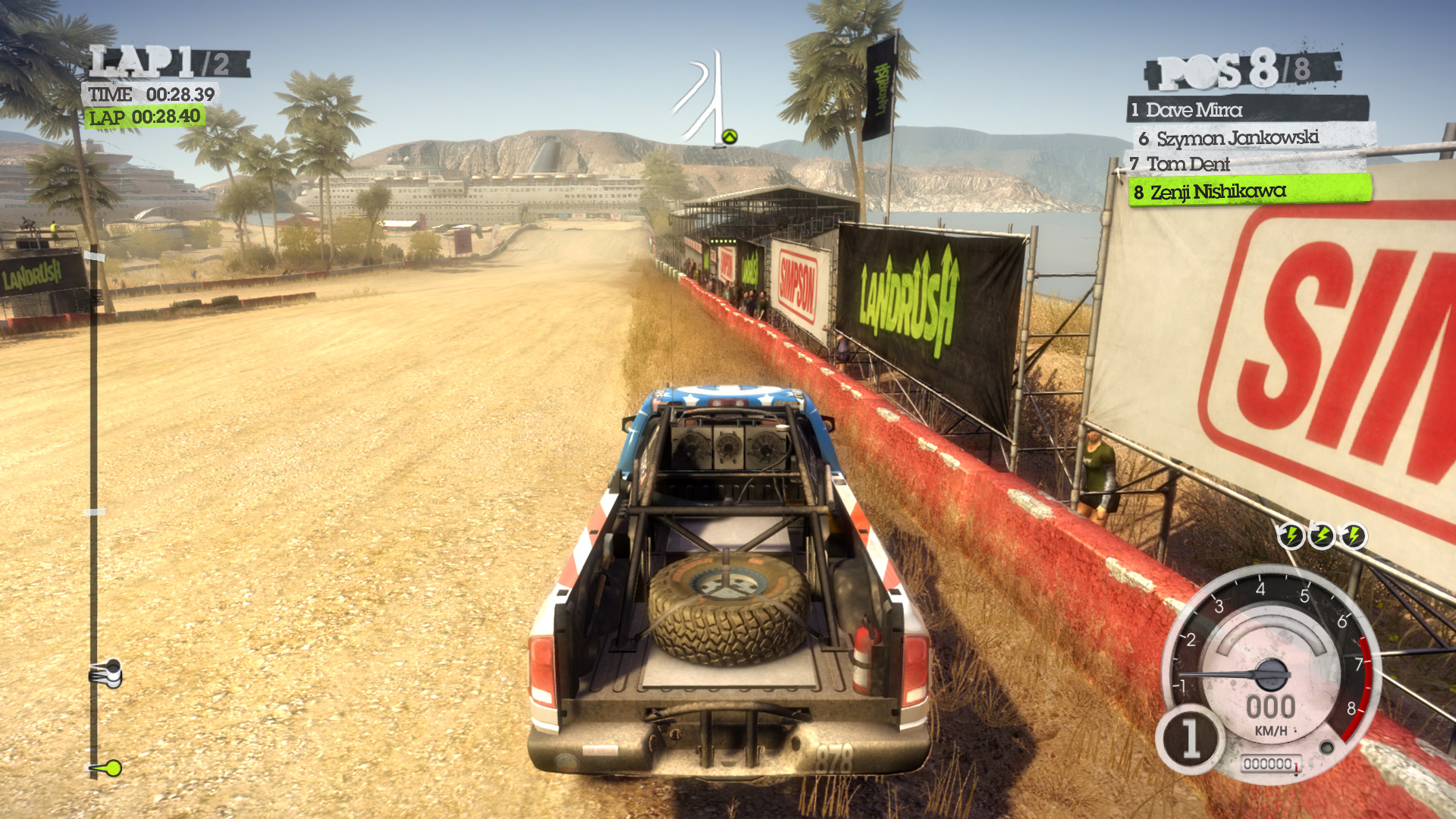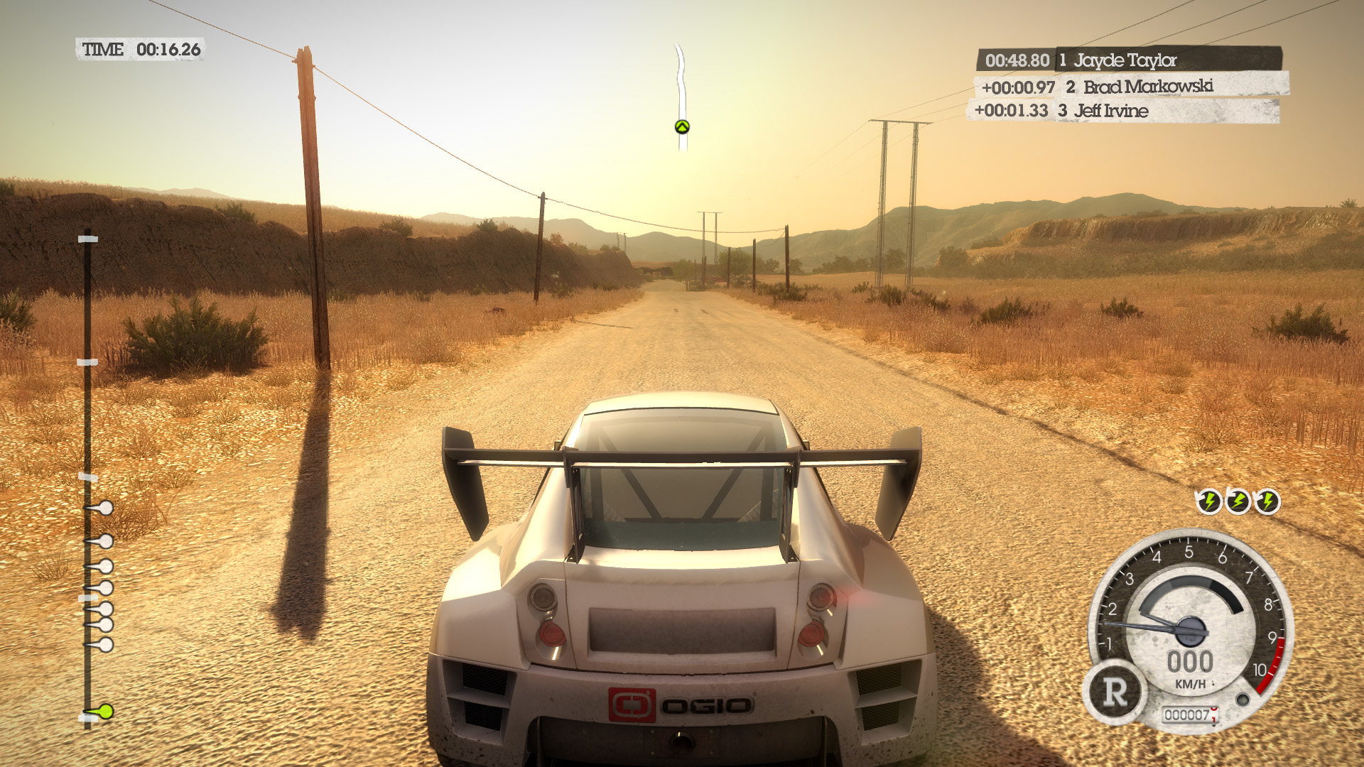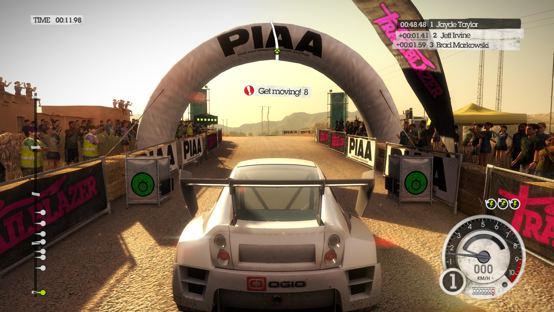DiRT 2の影生成は,あまり高度なものではないようで,最高位設定のHIGHでも,光源が遠い影には強いジャギーが出る。さらに群衆については,どのような設定でも影生成は行われない。