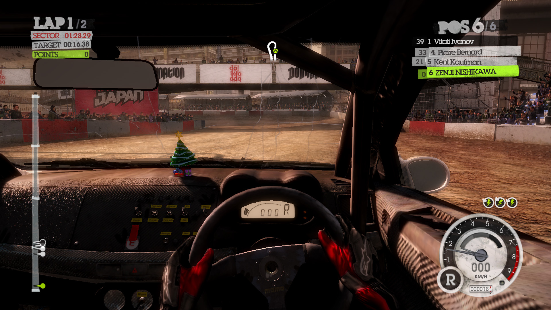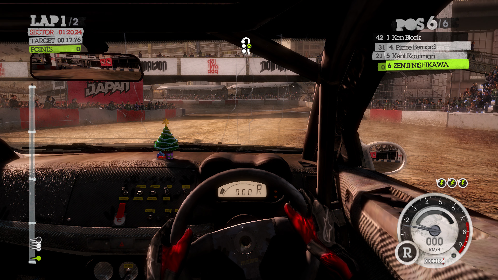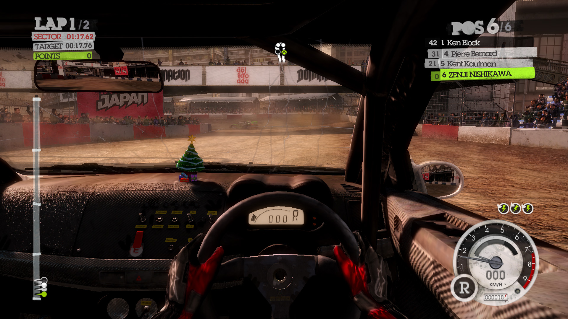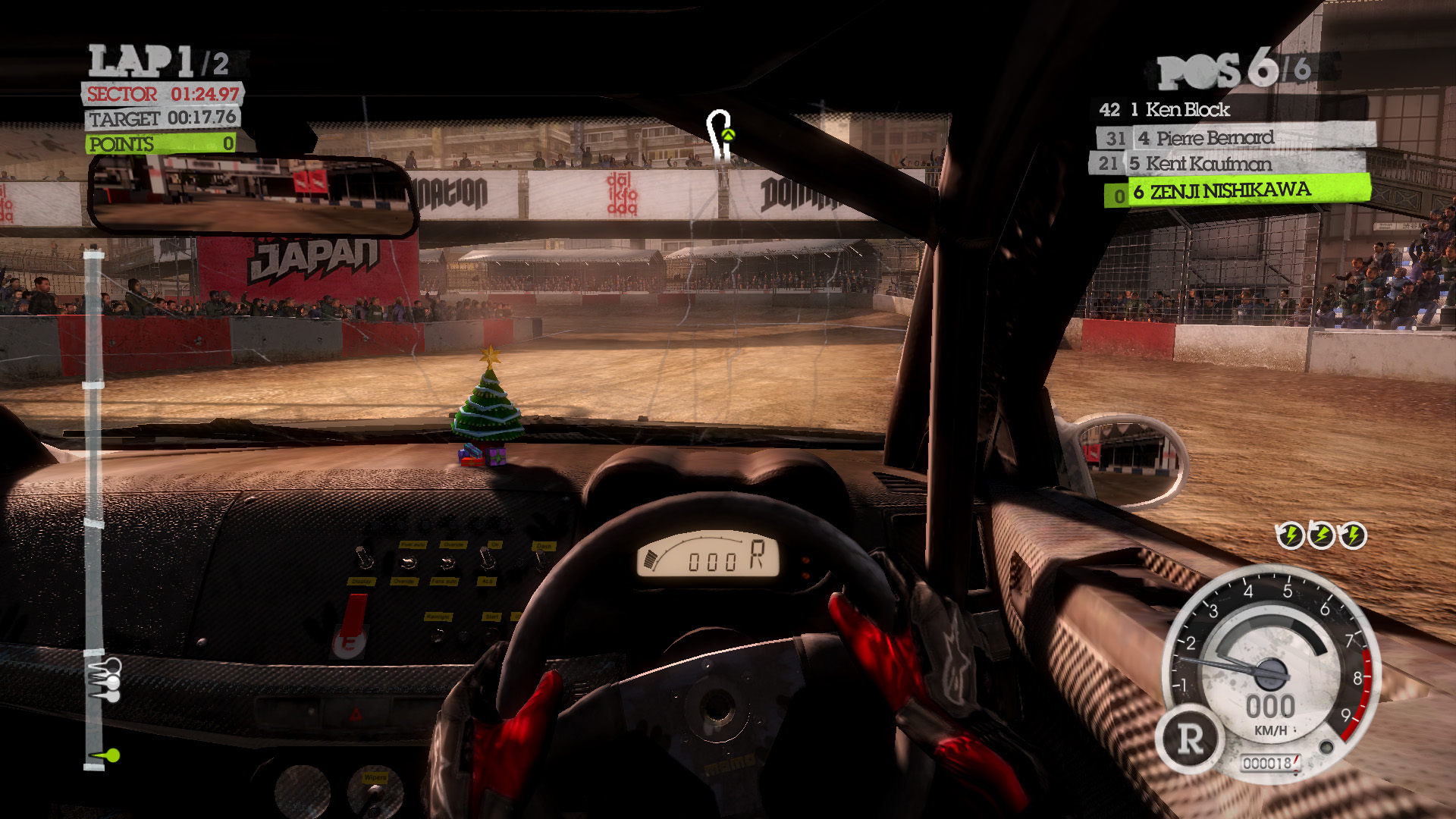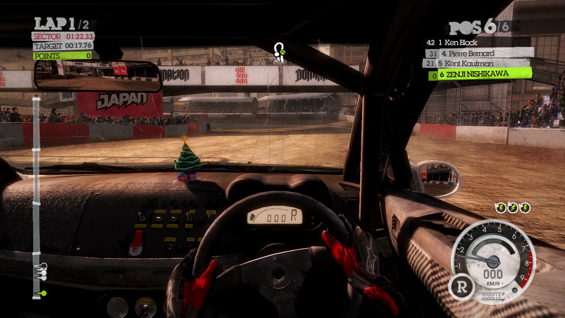 トリビアとしては,どの設定にしても(たとえULTRA設定でも)バックミラーには群衆の姿は描き出されない。目前に広がる観客席は満席でも,バックミラーに見える観客席はすべて空席となっている。プレイ時に確認してみよう。