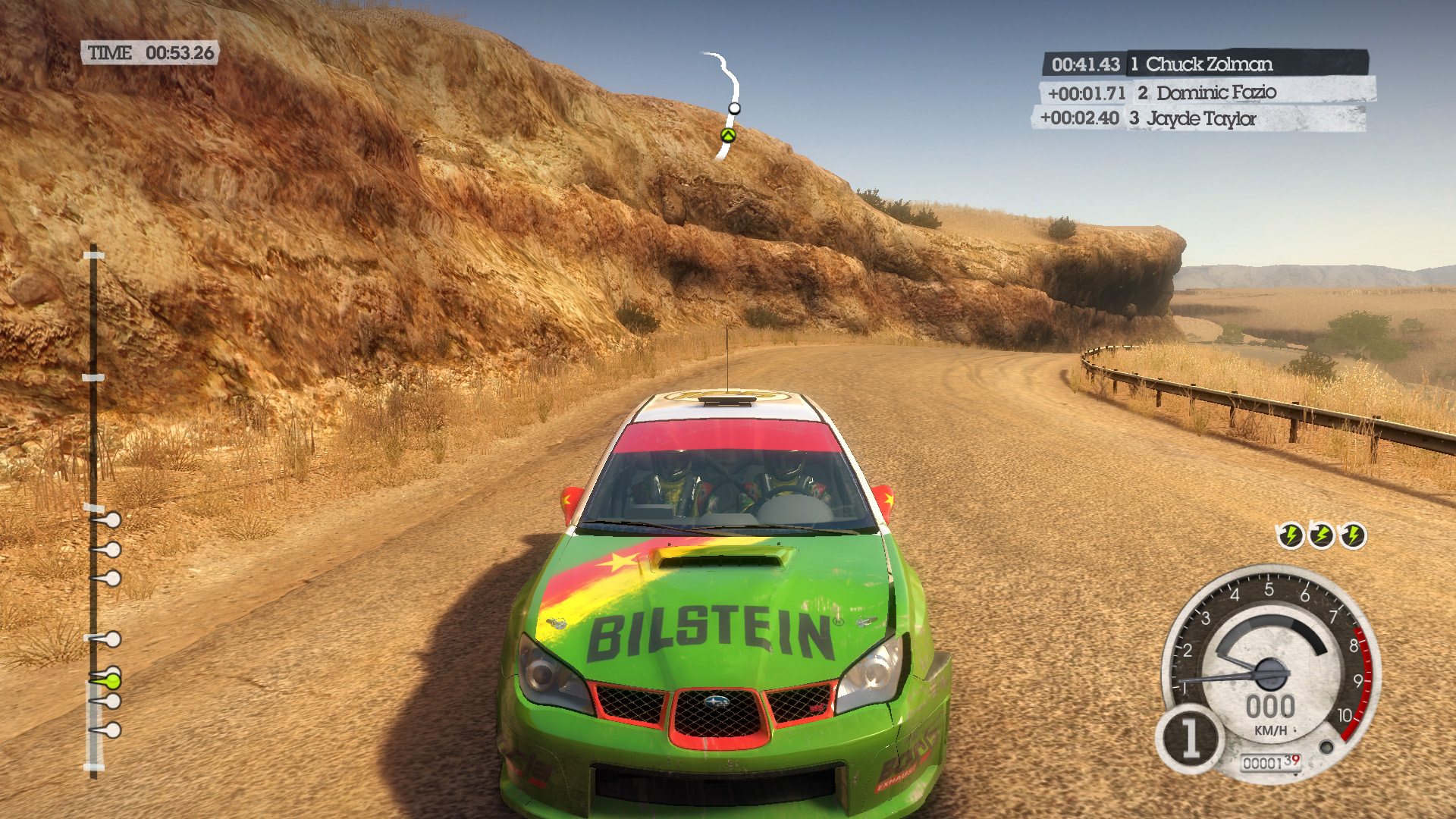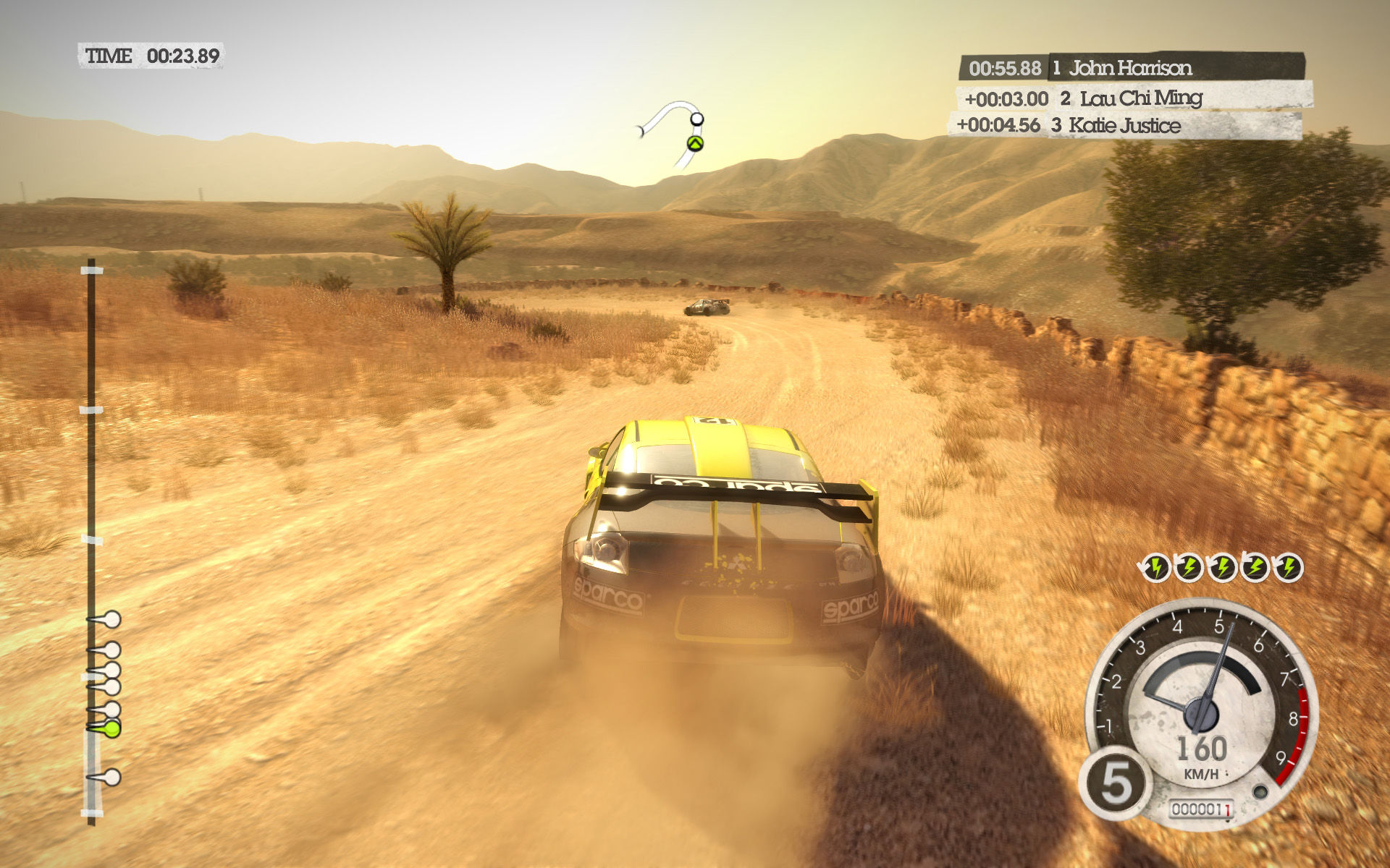 ほかの車両がボディへ映り込む表現まで確認できるDiRT 2だが,LOWを選んだときには,映り込む敵車のみを低ポリゴンモデルで描いて負荷を低減させているようだ。なかなか芸が細かい。