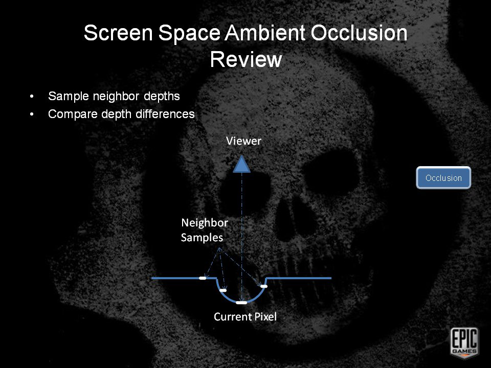 間接光が周り中から均等に照射されていると仮定し,Zバッファ上の奥行き値一つずつに着目して,そこが,ほかの物体によってどれくらい遮蔽されているのかを調べ,その遮蔽状況に応じて陰影を付けていくのがAMBIENT OCCLUSIONだ。