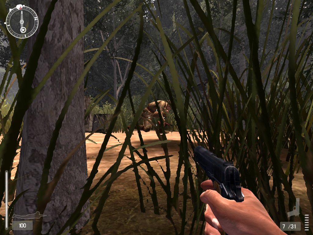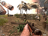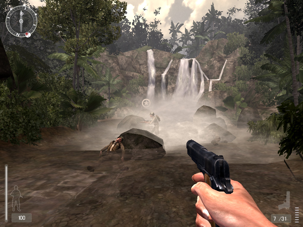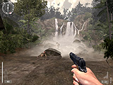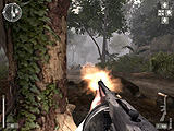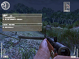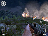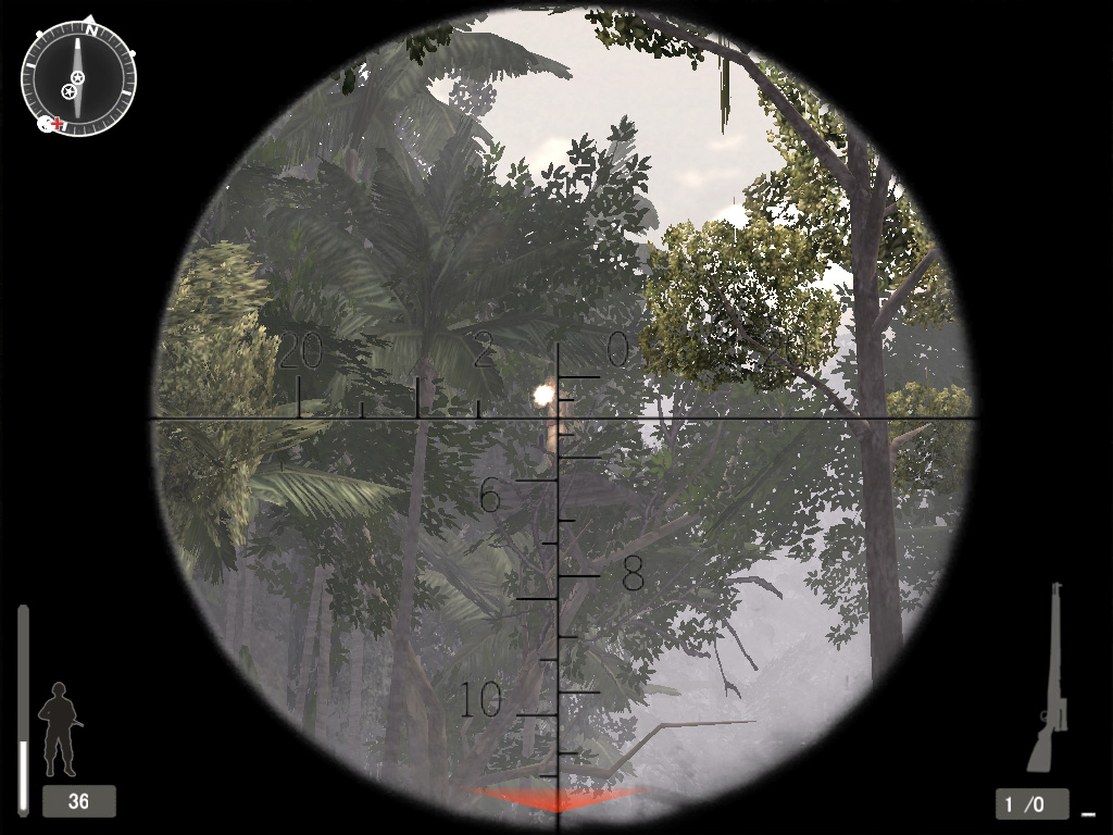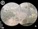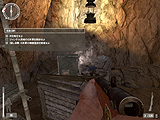 集積場を爆破すると川を横断していた橋も爆破され,先に進めるようになる。少し進んだところで,敵の狙撃兵がうろうろしているのに出くわすので,即座に射殺し,狙撃銃を奪っておこう。ここから少し進むと,どこからともなく狙撃されるはずだ。狙撃兵はカモフラージュしていることもあって,見つけにくい。発見が遅れると確実に死ぬことになるので,敵のマズルフラッシュに目を光らせるか,狙撃銃のスコープを使って敵を見つけ出し,できるだけ早くすべての狙撃兵を倒そう。