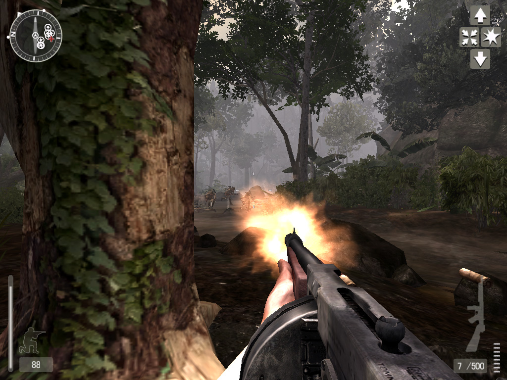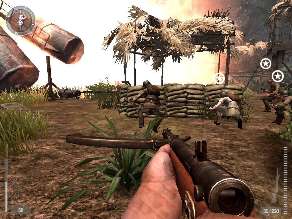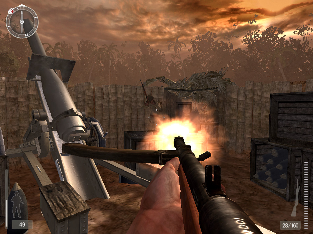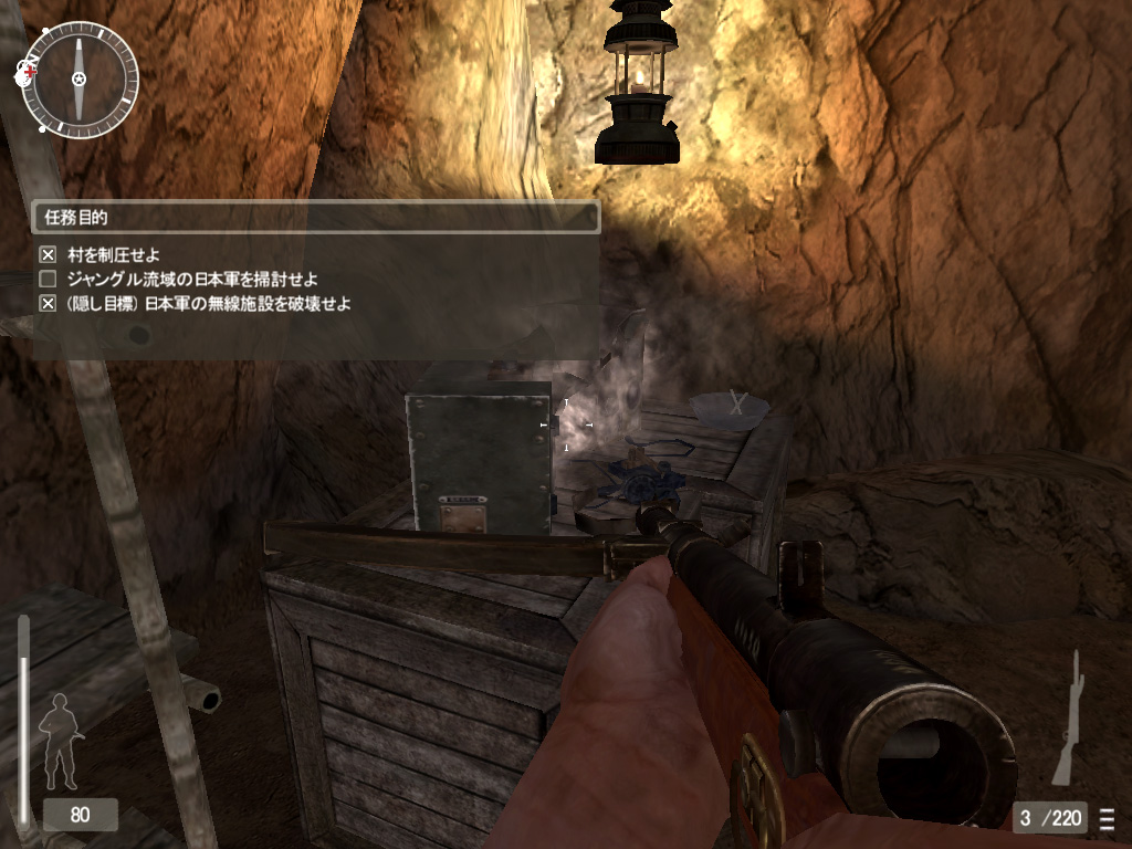 ある程度進むと,沼地に行き当たる。ここでもそこかしこに敵の歩哨が潜んでいるので,細心の注意を払いながら進もう。うまく沼を抜けたら,日本軍のいる村があるので,制圧しなければならない。この村で弾薬の集積場を発見することになるので,見つけたら爆薬を仕掛け,破壊しよう。