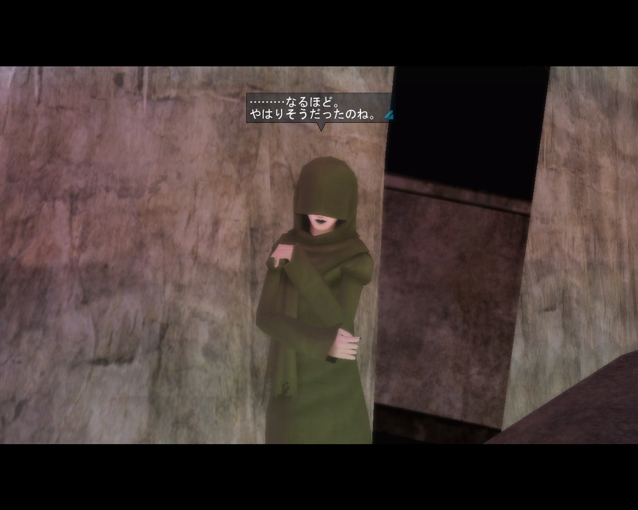 廃ビルの間を走り,瓦礫の山を越え,魔階トチョウが目前まで迫ったところで,何者かがいることに気付いた。全身をローブで包んだ女だ。フードを目深に被っているため,その表情をうかがい知ることはできない。