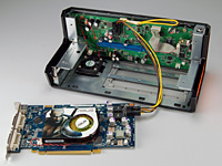 開発途上版らしい,“手作り感”のある筐体を開けてみると,中にはPCI Express x16スロットが用意されており,「GeForce 7900 GS」搭載のASUSTeK製グラフィックスカードが差さっていた。前述したとおり,このPCI Express x16スロットは1レーン接続になるが,「GeForce 7600 GT,クロックアップ版GeForce 7900 GT,GeForce 7900 GTXを利用したテストで,