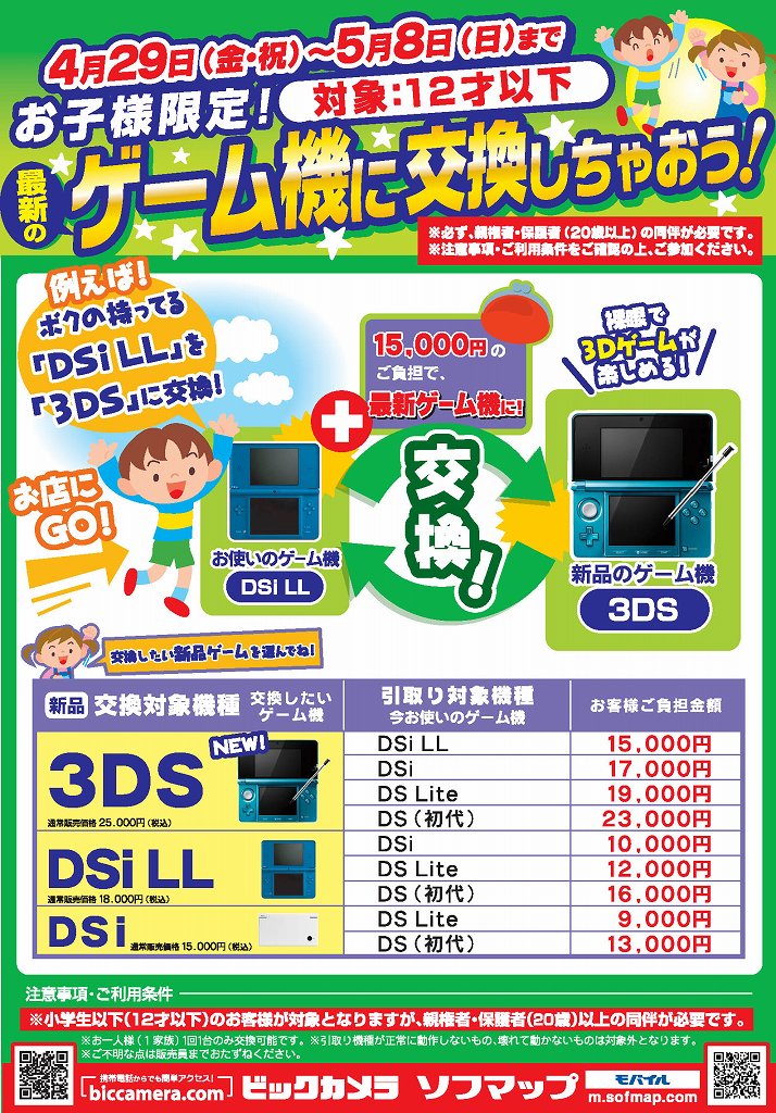 ビックカメラ&ソフマップで12歳以下限定のニンテンドーDS下取りキャンペーン