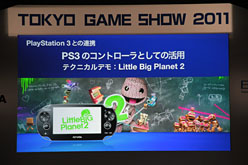 セッションでは,特別仕様の「リトルビッグプラネット」が用意され,PS3とPS Vitaとで協力プレイするさまが紹介されたのだが,PS Vitaを単なるDUALSHOCK 3互換コントローラとして使うのではなく,タッチパネルを使って飛行機を動かすなど,ハードウェアを活かした,拡張コントローラ的な使い方が可能になっていたのが印象的だった。これまでのPS3(+DUALSHOCK 3)では実現できなかった,新しいゲーム体験への展開が期待できる内容になっていたといえるだろう。