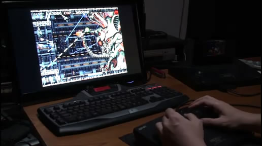 今回の評価では,筆者の私物のNEO-GEO(ROM機)で,幻のシューティングゲーム「パルスター」を動作させ,XSYNC-1とSC-500N1/DVIのコンビで録画を行ってみた。今回評価では,8ピンDIN端子のパススルーを使う機材(テレビやケーブル)を揃えることができなかったので,SC-500N1/DVIのプレビュー画面でのプレイをしながらの録画となったが,その模様を撮影したものが下のムービーだ。その下には録画したムービーそのものも置いてみている。
