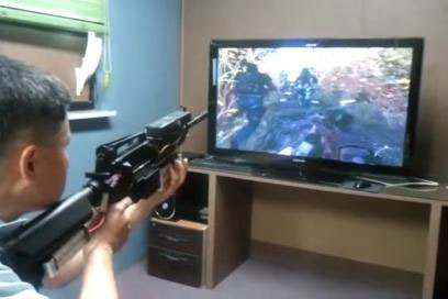 G-Star 2011会場のど真ん中あたりを通ると,Samwon Softの小さなブースから大音量の銃声が鳴り響いていた。何事かと覗いてみたところ,ディスプレイの前にアサルトライフルやスナイパーライフル,ハンドガンなどが置かれており,さらにブースで流れていたプロモーションムービーには,それらの銃を使ってFPSをプレイする姿が映されているではないか。これは面白そうだと,さっそく話を聞いてみた。