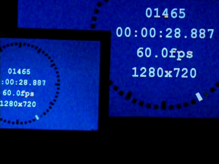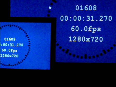 まず測定したのは,1つのテスト映像を分配して26ZP2と55ZG2に直結した接続ケースだ。これは26ZP2と55ZG2の両者の表示遅延スペックの違いをあらかじめ把握しておく意味合いのテストになる。単純計算で55ZG2の方が約0.9フレーム遅く映るはずで,実際にも26ZP2のほうが僅かに進んでいる結果を見て取ることができる。