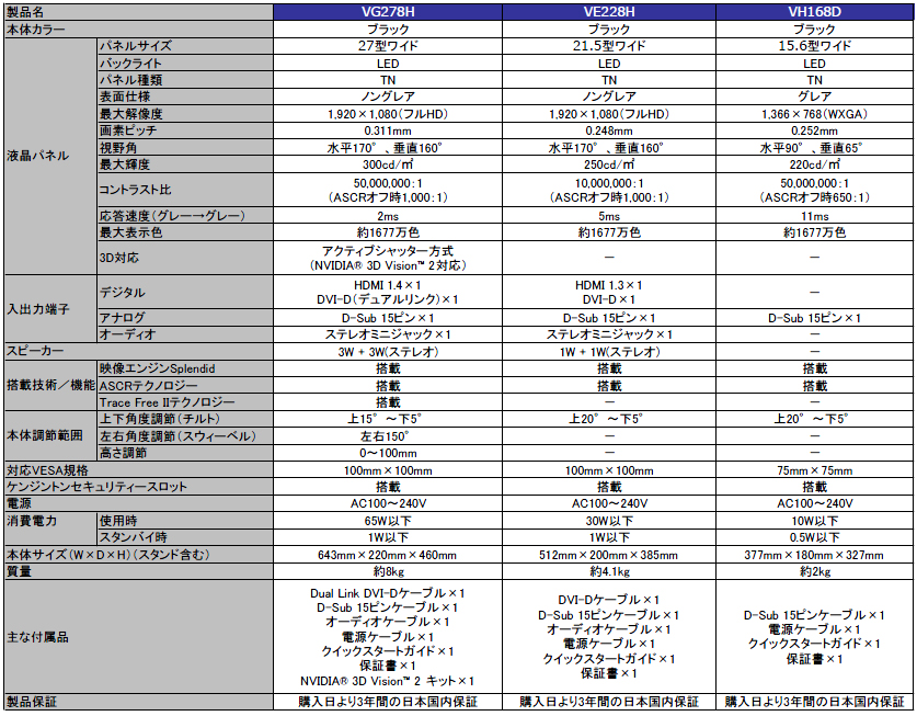 ASUS,3D Vision 2対応で120Hz駆動の27インチディスプレイを発売