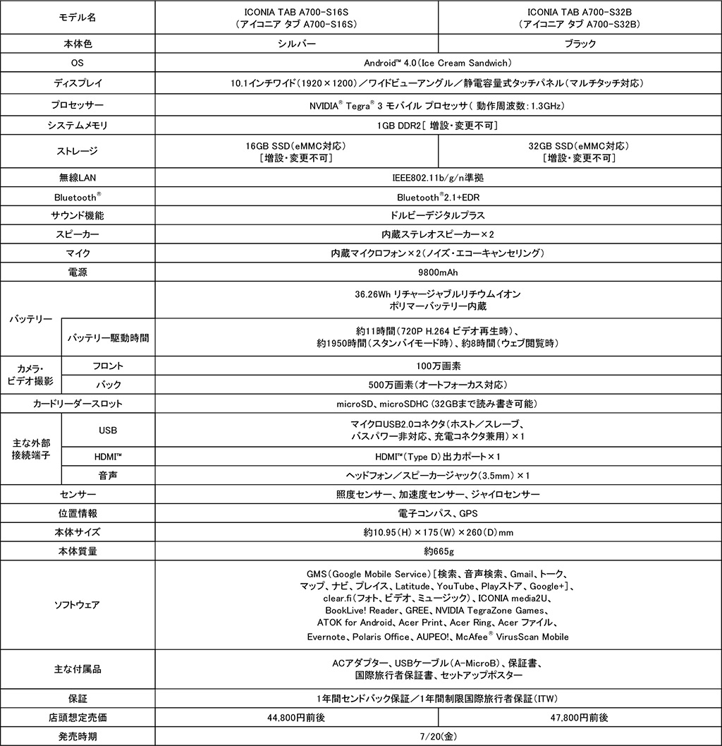 フルHD液晶搭載のAcer製Androidタブレット「ICONIA TAB A700」本日発売