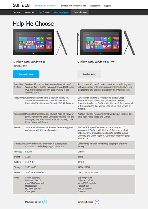 SurfaceにはWindows 8搭載モデル「Surface with Windows 8 Pro」も存在するが,こちらは当初の予定どおり,Windows 8の発売から約90日後の発売予定となっている。直販サイトの表記は「Coming soon」だった