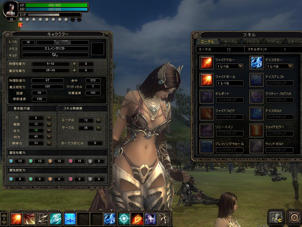 スキル例:ヒーラータイプの精霊を召喚する「ライフスピリット」,火・水属性に対する抵抗力を高める「マークオブファクション」