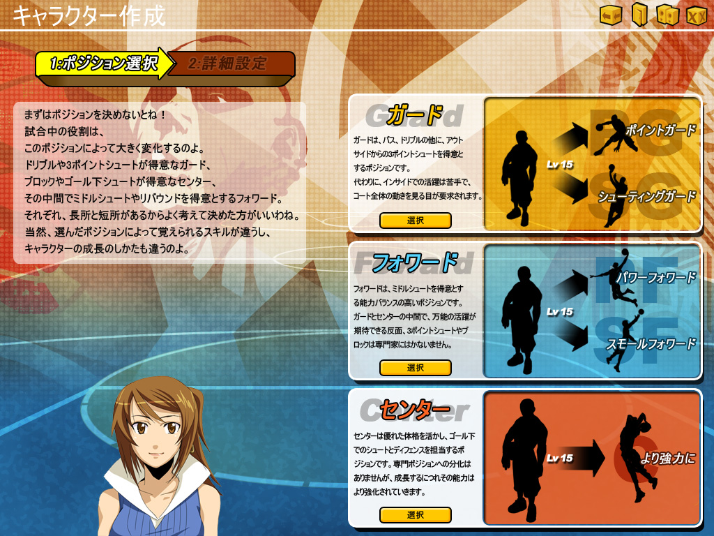 各ポジションの特徴と役割は以下のとおりで,それぞれ得意な分野が違うのだが,初心者におススメなのはフォワードだろう。フォワードはコートの中央でディフェンス役をこなし,敵チームの隙を突いてミドルシュートを決めるといった具合に,バランスよく攻守を楽しめるポジションだからだ。初心者が無理なくゲームを把握するにはもってこいなのである。もちろん,センターやガードになにか熱い思い入れがあるのなら,そちらを選んでも問題はない。