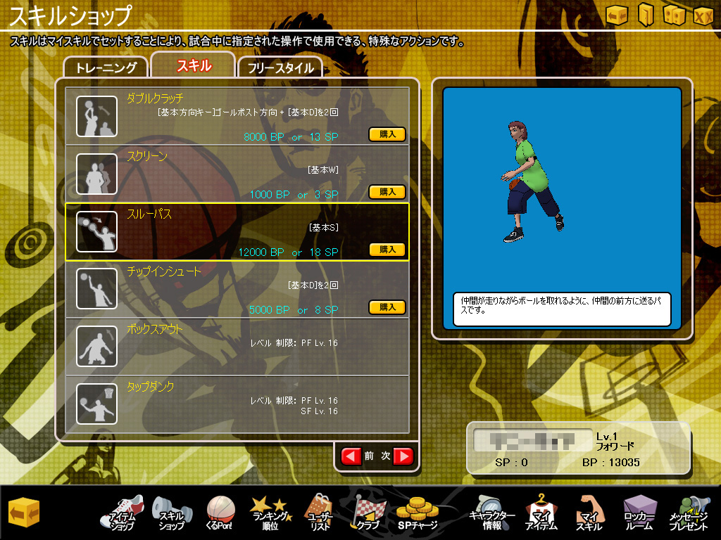 なお,チュートリアルおよびミッションをクリアしていくと,経験値が蓄積してキャラクターレベルが上がるのだが,それと同時にBPも貯まっているはず。ここで,初心者がBPを使って入手してほしいのが「スルーパス」スキルだ。これは走りながらパスを受けられる便利なスキルで,JC Globalのスタッフも「まず習得すべき,ほぼ必須スキル」としてオススメしている。スルーパスは,キャラクター作成時とチュートリアルを初めてクリアした際に与えられるBPだけでも入手可能なので,確実にゲットしておきたい。