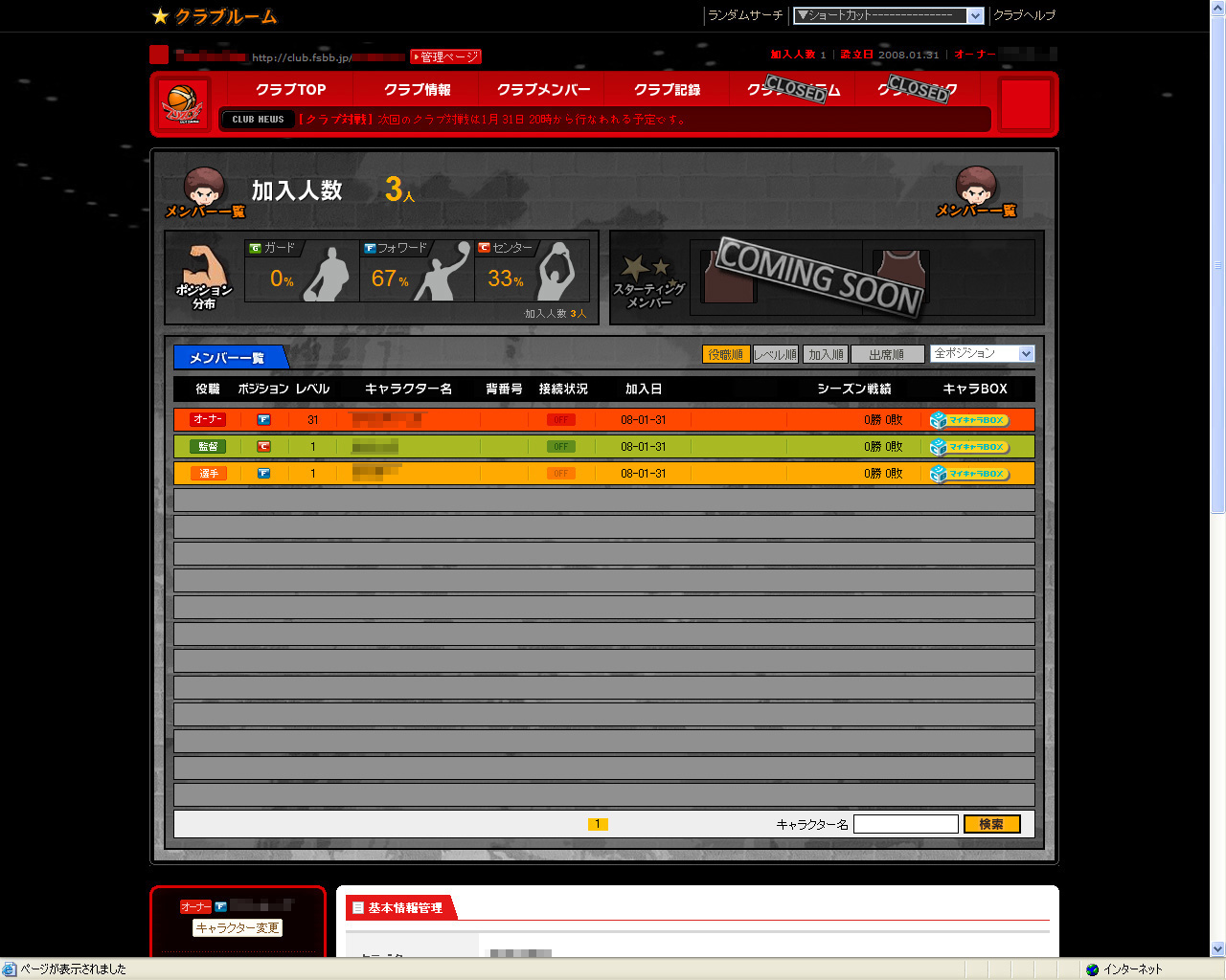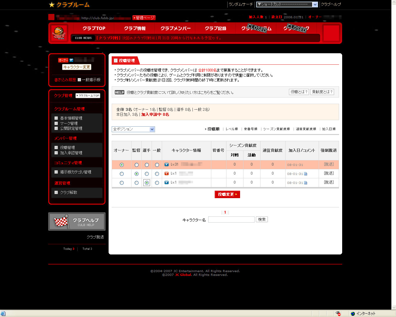 クラブ内には,オーナー/監督/選手/一般といった役職がある。オーナーはクラブの設立者で,初期投資ぶんのBPとSPを負担する代わり,クラブ管理について最高権限を持つ,文字通りのオーナーだ。監督はオーナーをサポートしてクラブをまとめていく役職で,オーナーの指名により1クラブに最大3人まで設定できる。で,残りのメンバーは,選手または一般という扱い。なおクラブメンバー数の上限は1000人となっているので,よほど参加希望者が多くない限り,加入人数制限で頭を悩ませることはなさそう。
