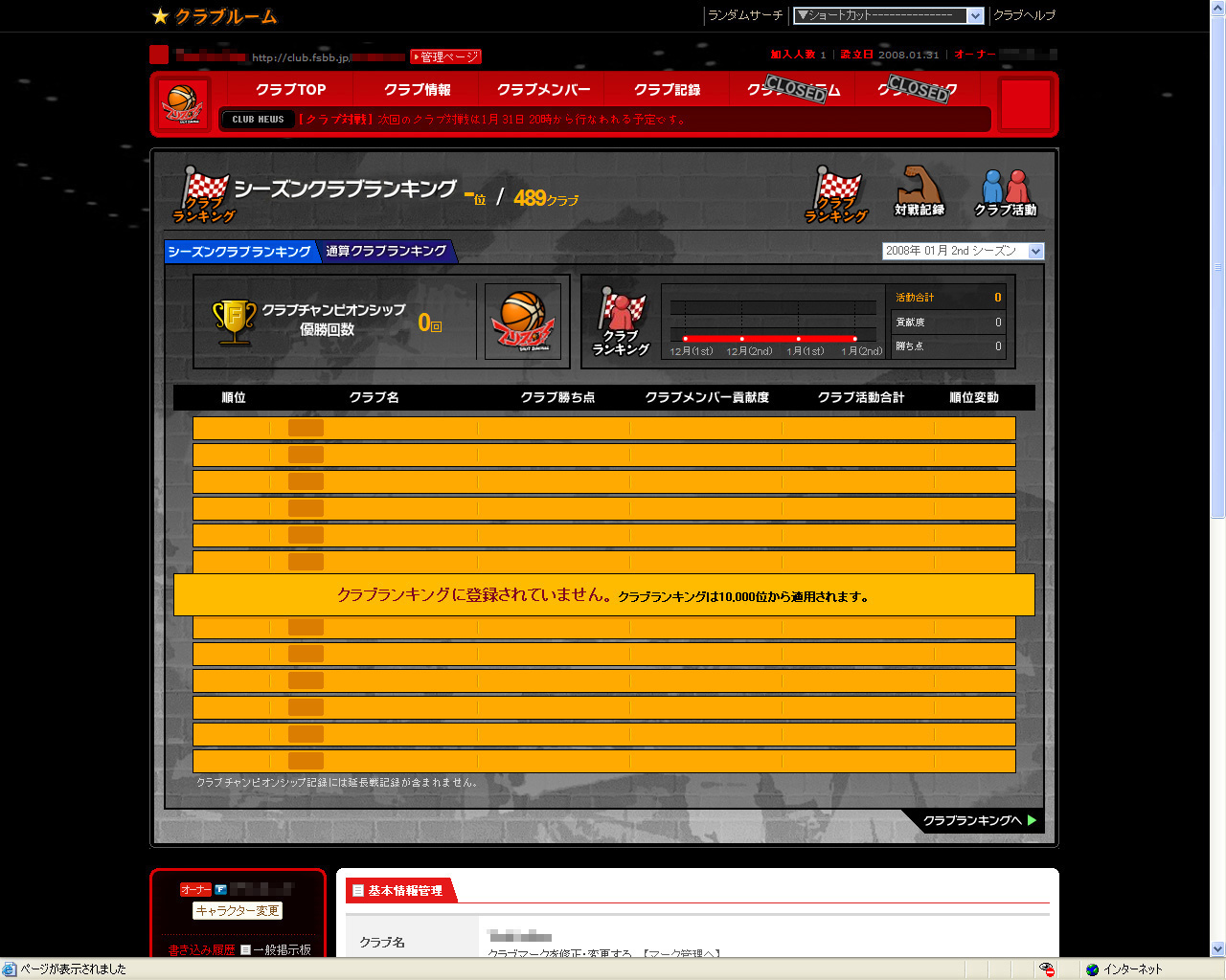 「クラブランキング」は毎月1日から15日までの1stシーズンと,16日から月末までの2ndシーズンに分けて月2回更新される。このランキングの面白いところは,クラブ対戦の結果だけでなく「クラブメンバー貢献度」によっても判定される点だ。クラブメンバー貢献度は,クラブルームでの活動で評価されるもので,現在は下記のクラブルーム掲示板へ書き込みすれば1ポイントが加算される(ただし,メンバー一人につき1日1ポイントのみの計上となる)。「部室の掃除」とか「買い出し」とかがあれば面白いけど,Webページなのでそれは無理なのである。