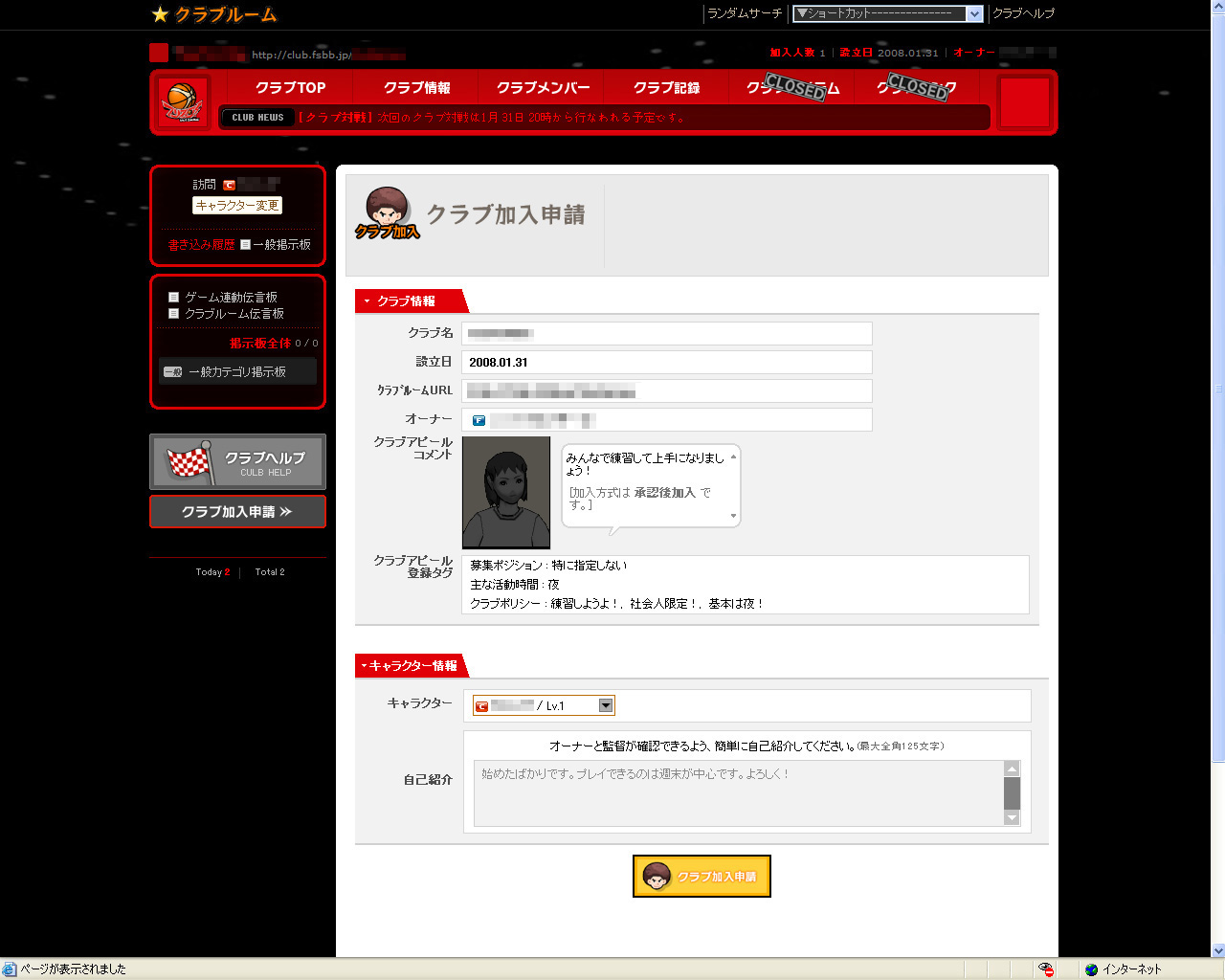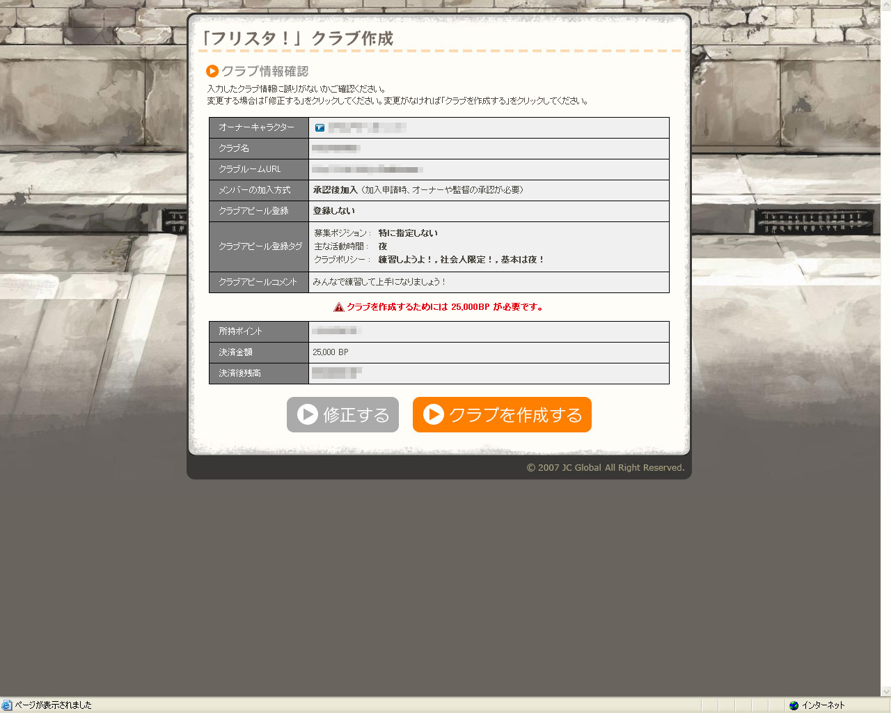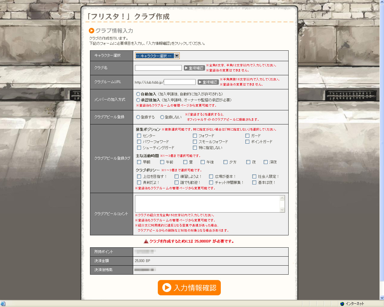 クラブを作ってそのオーナーとなるための必要条件は,そのキャラクターがどこのクラブにも所属していないことと,開設費用の2万5000BPを持っていることだ。あとは公式サイトの「クラブアピール」のページなどにある「クラブ作成」ボタンをクリックし,表示されるページに必要事項を記入すればオッケー。ちなみに,一人で複数のキャラクターを持っている場合,クラブオーナーとなるキャラクターを一人決める必要があるので注意が必要だ。