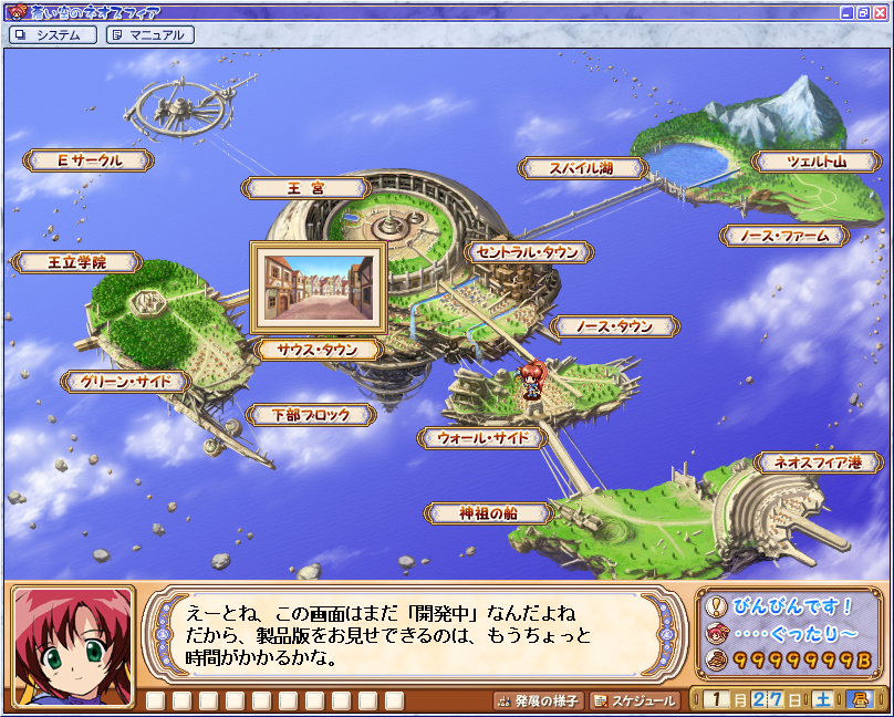 「蒼い空のネオスフィア プロローグ」は,ゲームのアドベンチャーパートを使って,舞台となる空中都市ネオスフィアを案内してくれるというもの。ミッション/経営パートは残念ながら試せないが,正式パッケージの発売に先立って少しでもゲームの内容を知りたいという人には,楽しみな要素といえる。