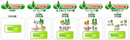 これは期間中(12月19日3:00PM〜29日2:00PM),野菜村に現れるクリスマスツリーを集めた人を対象に,その数に応じてオリジナルクッションやぬいぐるみが,抽選でプレゼントされるという内容だ。