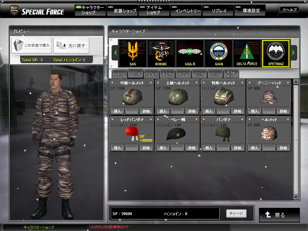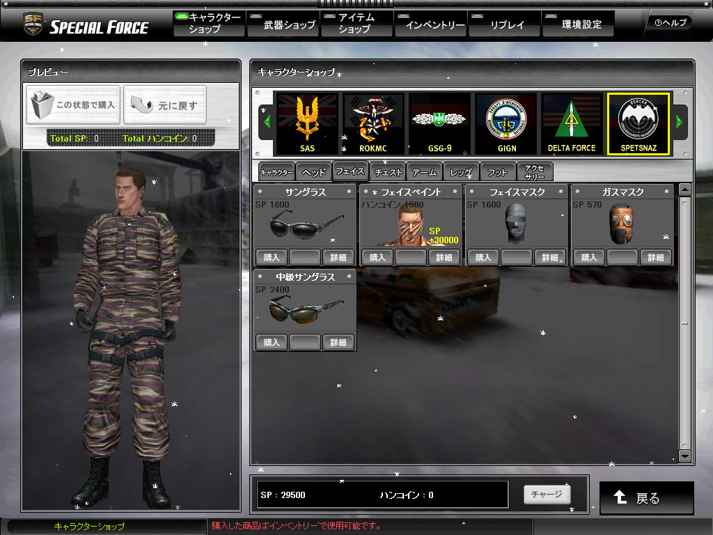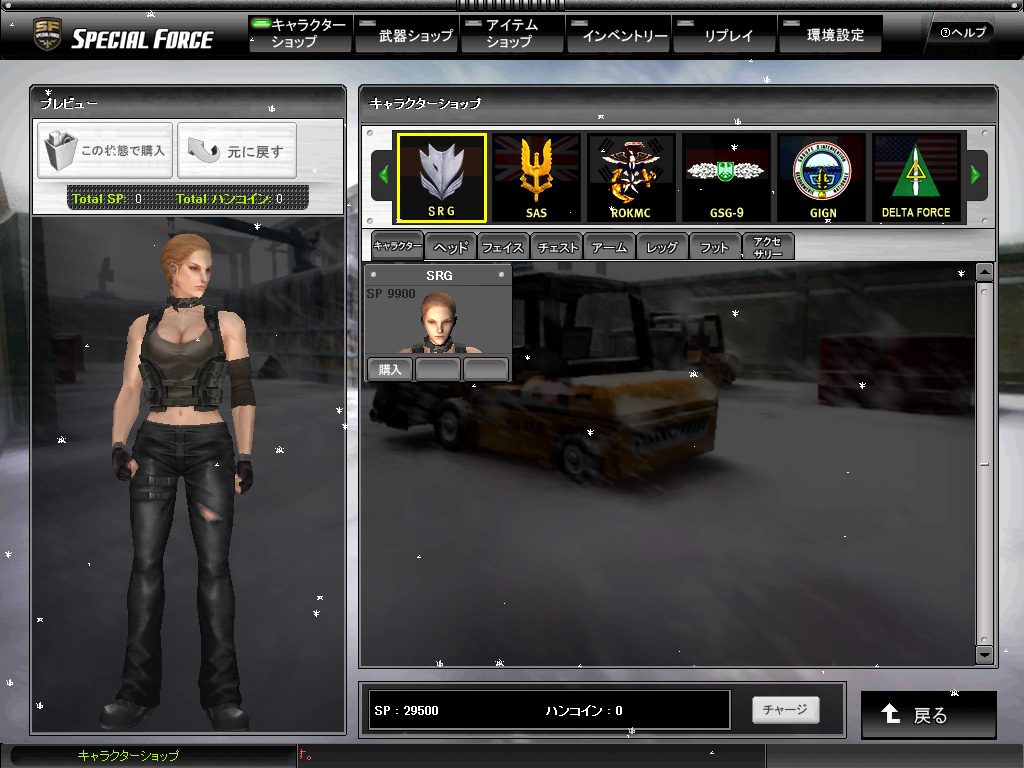 ゲームに入ると,最初に支給される「スペシャルポイント」(SP。後述)を使って7種類の特殊部隊から一人を選ぶことになる。謎の特殊部隊であるShadow Ranger Groupの女性隊員だけ妙に高価だが,それ以外は同じ値段なので,好きな部隊を選ぶのだ。しかるのち,武器と防具を彼(もしくは彼女)に買い与えれば,戦場に出る準備は万端だ。
