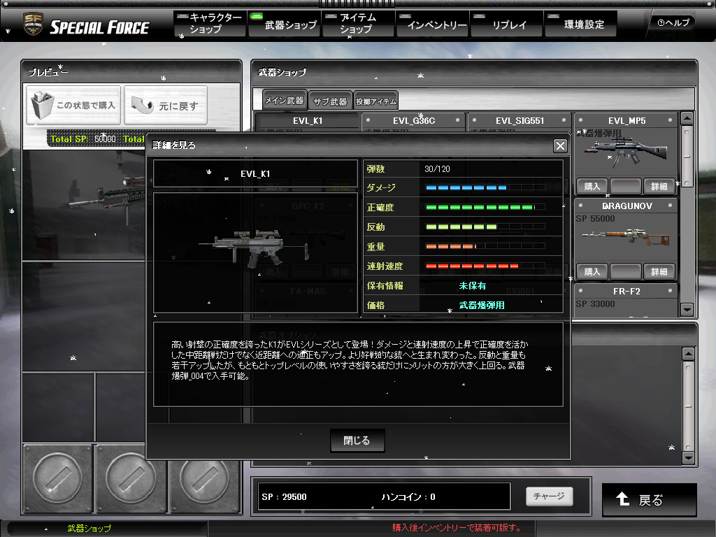 さて,一試合終了すると,経験値である「階級ポイント」と,上述したスペシャルポイントがもらえる。階級ポイントは読んで字のごとくレベルアップに関するものだが,スペシャルポイントはゲーム内通貨である。武器の購入はこのスペシャルポイントで行うことになるのだ。もう一つ,ハンゲーム内で使われるハンコインによって購入するハンコインアイテムがあり,これがつまり有料アイテムになる。ちなみにスペシャルポイントは,チャージゲージに溜められていき,ゲージが一杯になった時点で階級が上がり,一気に10000SP支給となるのだが,マックスになるまでは全然使用できないという仕様。