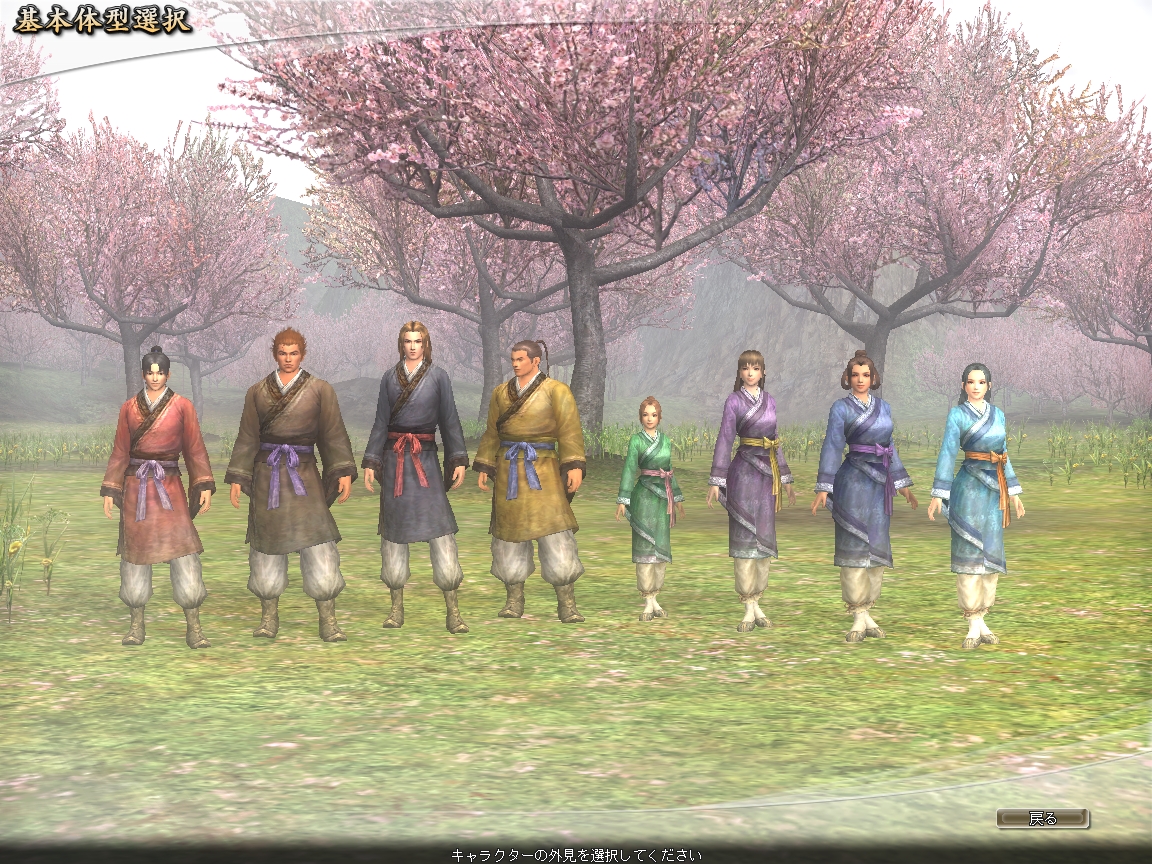 三國志 Onlineのキャラクターメイキングでは,まず初めにキャラクターの基本体型を選択する。選べる体型には男性4種類,女性4種類が存在し,つまり男女の選択もここで同時に行うことになる。このように体型の雛形が数種類用意されていて,そこから選んでいくというキャラ作成方法はなかなかユニークだ。