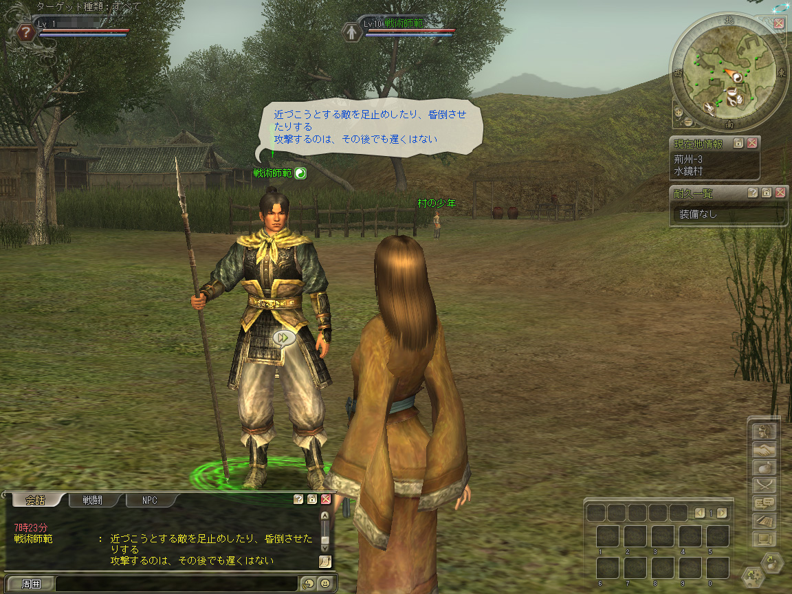 ゲームにログインすると,キャラクターは荊州の「水鏡村」に降り立つ。すると目の前に,頭上に“閉じた竹簡”を浮かべたおじいさん(水鏡)がいるので話しかけよう。この閉じた竹簡は「このNPCがプレイヤーに対する“依頼”を持っている」ということを示している。