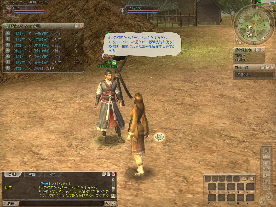 初心者用の依頼のうちの一つ「戦闘の道」は,6人いる各戦闘技能の師範に話を聞いて回るというもの。師範は,その位置から門をくぐって坂を下りたあたりに立っている。頭上に依頼の目標であることを示す“開いた竹簡”が出ているのですぐに見つかるはずだ。