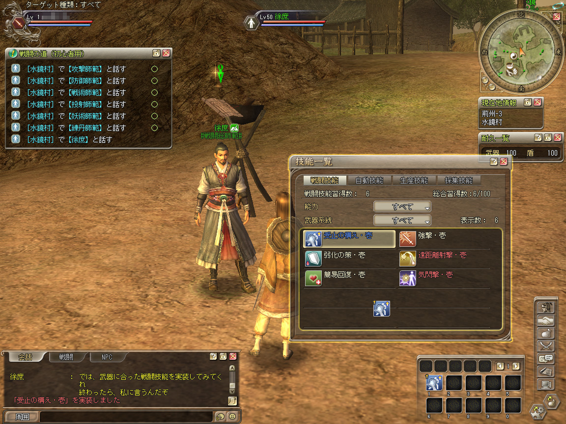 この6人の師範はそれぞれの戦闘技能に関する説明をしてくれて,技能を一つと,さらにその技能を使うために必要な武器をくれる。本来はここで最初に伸ばす武器系統を検討するのだが,本稿においては先ほどすでに決めているので,6人すべてに話を聞いたら門の側にいる武将“徐庶”のところに行く。徐庶は,ここでは“戦闘総師範”とも呼ばれている。