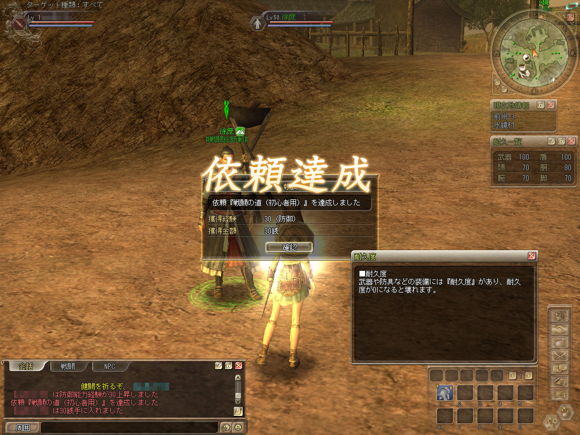 再び徐庶に話しかけると,装備中の武器にフィットした防具を一式もらえる。このとき防具は自動的に装備される。そのまま会話をすすめるとこの依頼は終了して金と経験が入手できる。