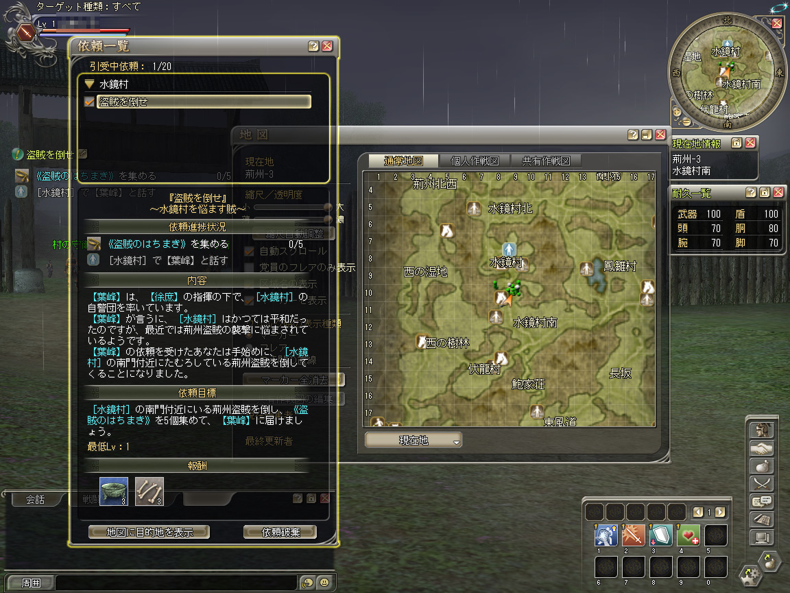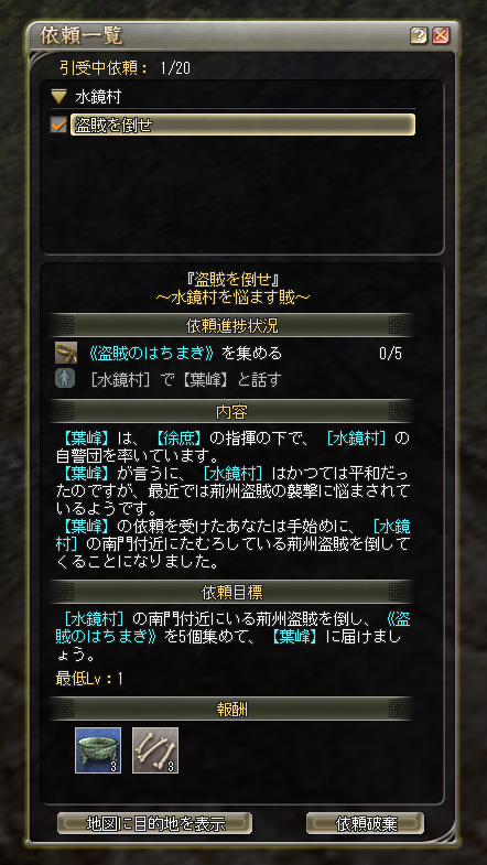 内容を確認すると,これは「盗賊のはちまき」というアイテムを5個集めてくれという依頼らしい。目当ての盗賊は「水鏡村の南門付近にたむろしている」とのこと。なるほど,それらを見つけて何体か倒し,その証拠品を持って葉峰のところに帰ってくればよいわけだ。