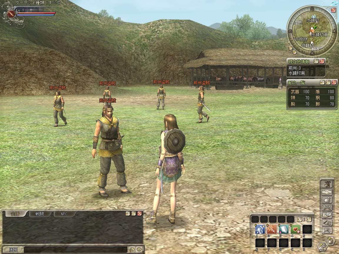 それでは盗賊を探しに出発する。「地図」のウィンドウを開いて(ホットキーはM)確認するとほぼまっすぐ南に向かったあたりに「南門」があるようだ。眺めると,すでに門らしきものが見える。そこまで走って門を抜け村の外に出ると「荊州盗賊」という名前のNPCが,十体以上うろついているのがすぐに見つかった。よし,倒そう。