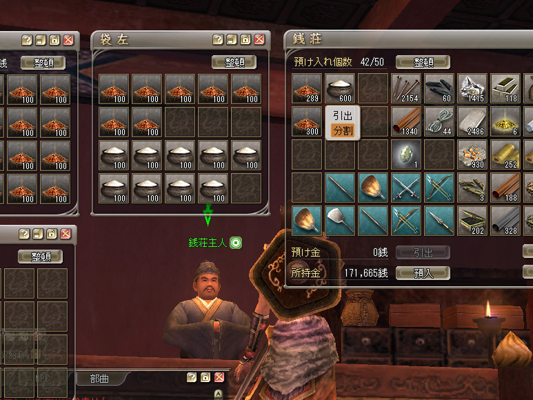 銭荘内から100個以上重なったアイテムを一気に引き出したい場合は,右クリックメニュー「引出」を選択するとよい。1回の操作でインベントリー内に適切に移動する。銭荘から任意の個数だけ引き出したいときは,銭荘内で右クリックメニューを使って「分割」したあとに,「引出」を行えばOKだ。プレイを続けるうちにどんどんたまっていく生産材料系のアイテムなどは,この仕組みをうまく使って賢く管理していきたい。