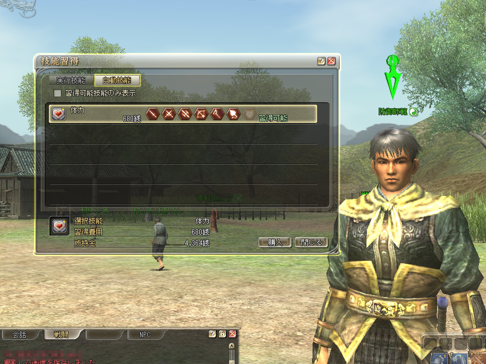 戦闘能力レベルが10に達すると,初めての「自動技能」が師範から習得可能になる。「自動技能」は技能習得用のインタフェース上では別タブになっており,うっかり見落として,習い忘れることがあるので気を付けたい。