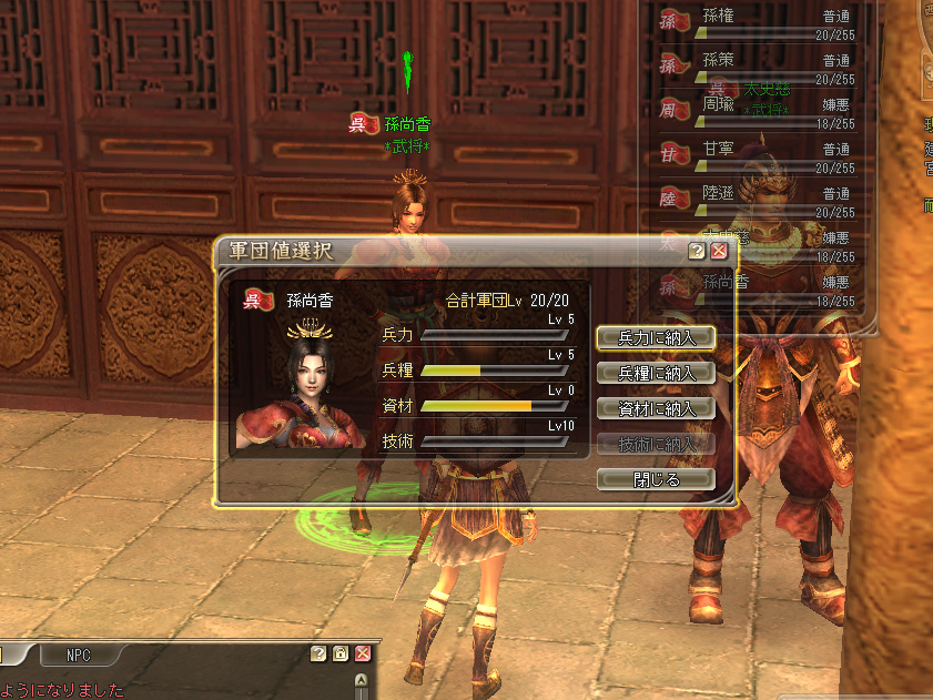 各勢力には君主のほか,6人の主要な武将が存在する。プレイヤーが主に関わりを持てるのは,この各国7名,合計21名の有名武将達だ。彼らは平時は主要都市の宮城(ときおり街角)にいる。彼らは強力だが雲の上の存在ではなく,直接会いに行くことができ,話しかければそれに応えてもくれる。普段から彼らと触れあい,ときには戦場で肩を並べて戦うことも可能であることは,三国志を題材としたMMORPGである本作ならではの魅力だといえる。