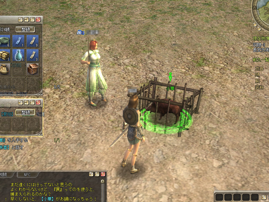 大賑わいの銭荘前でほかのプレイヤーたちが売っているものを少し見て回ったあと,筆者のキャラクターは町を一周して,もらえる「依頼」を端から受けていくことにした。確か,以前のプレイではこの町にもたくさんの依頼があった……と記憶していたのだが,どうも様子が違う。荊州でプレイしていたときにも思ったのだが,どうも第一次プレオープンと第二次プレオープンの間に行われた改良で依頼が整理され,その結果,依頼の数が絞られているようなのだ。