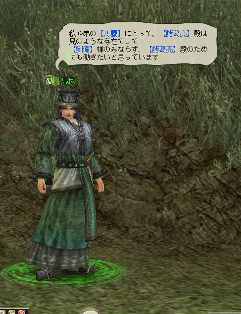 蜀の募兵係の近くには【馬良】が立っている。いうまでもなく【馬良】は,優れた人のことを表す「白眉」という故事成語のもとになった人物だ。水鏡村の北門の近くで受けられる『白眉』という依頼では囲碁試合の招待状の配達を頼まれるが,その届け先がこの【馬良】である。村の囲碁仲間の誰も優秀な【馬良】に勝てないので再戦を申し込む……という筋立てだ。