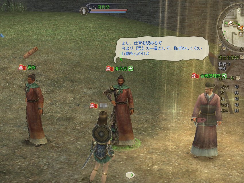 ソロハンティングはもう我慢できなくなってきたので,軍略の様子を見にいくことにする。そうなるといよいよ魏・呉・蜀のどの勢力に所属するか選択しなくてはならないが……実は初めから「呉」を狙っていたので悩むことなくすぐに仕官先を決めた。仕官は勢力の都のほか,長安でも水鏡村でも可能だ。今回は出発前に長安の募兵役に話しかけてすんなり呉の人となった。
