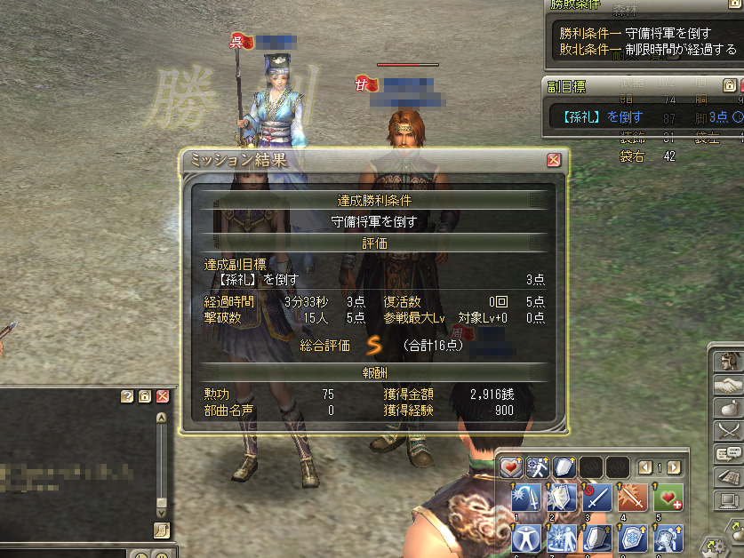 基本的なやり方を把握したあとは,ずーっと繰り返し軍略を行った。軍略は基本的にクリア報酬の金銭も経験値も割がよい。グループで遊べることの面白さもあって,飽きずに繰り返しているうち,戦闘能力レベルはするりと上がって20を超えた。ソロプレイだけで上げようとしていたら,もっと厳しい思いをしていただろうと思われる。