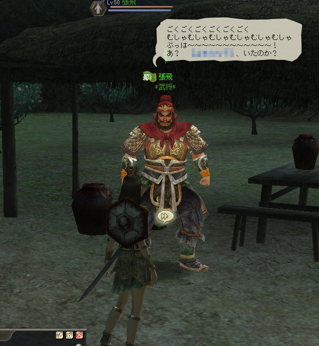 軍略をするグループに参加したい場合は,まずは軍略担当官のところに行って,チャットをチェックし,レベル帯が適合する募集があったらそれに応じる,というやり方がポピュラーだ。それに加えて三國志 Onlineでは頭上に10文字程度のメッセージを浮かべることができるので,そこに軍略参加希望であることと自分の武器系統とレベルを表示させておき,誘われるのを待つという手もある。