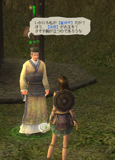 レベルが10に達してから【徐庶】に話しかけると,荊州の南にいる【崔州平】を紹介される。【崔州平】は【徐庶】とともに【諸葛亮】がとくに親しくしていた友人の一人だ。彼がくれる依頼の一つを進めると,荊州の賊を束ねているのが【董卓】の元家臣であった【張済】であることが分かる。【董卓】は三国鼎立以前に皇帝を擁して政治をほしいままにした人物だが,現在のところ三國志 Onlineの世界には登場していない。しかし,その【董卓】の残党が現在荊州を荒らしており,それを従えているのが【張済】という設定だ。【張済】は強敵なので仲間と徒党を組んでから挑みたい。