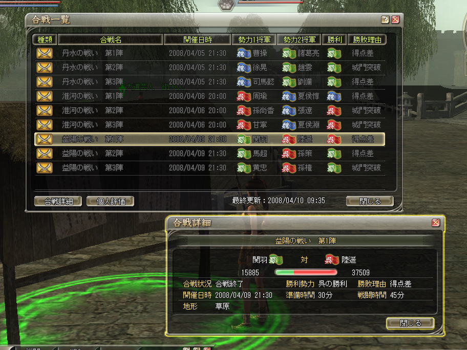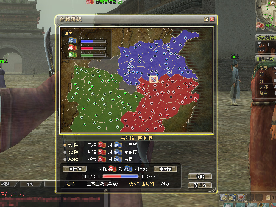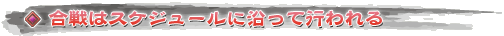 三國志 Onlineの合戦は公式サイトやゲーム内の掲示板などで事前に発表されたスケジュールに沿って行われる。1回の合戦の時間は現在のところ45分と決まっており,これが週に3回,水土日の夜に行われるのが定番のパターンとなっている。ただ合戦は毎回「1国 対 1国」のかたちで行われるので,どの勢力にも3回に1回は休みが回ってくる。だから実質的には週に2回のスケジュールだ。