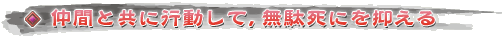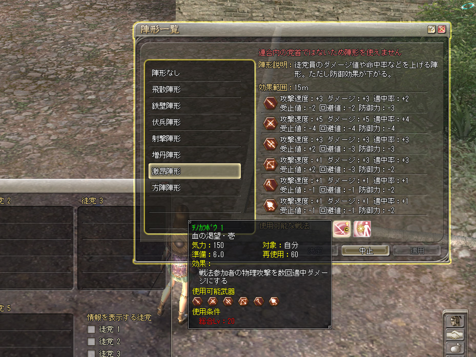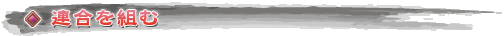 合戦場で「連合」(5人徒党×5のレイドグループ)を組むことの利点は大きい。連合を組めば各徒党の党首は「陣形」「戦法」が使用可能になる。これらには高い効果を持ったものが多い。これらは党員達がある程度集まっていないと使用できないが,そのことへの理解は自ずと集団で動くことへの意識を高めることにつながっていく。知人同士で連合が組めることが理想だが,もちろんゲームを始めて間もない頃は知り合いもいないだろう。そういうときは戦場で流れるチャットをチェックするとよい。合戦場では誰もが連合を組みたいと思っているので,募集のメッセージがいくつも流れているはずだ。「対話」チャットなどを使って連合の盟主と連絡を取り,連合に「勧誘」してもらうとよい。
