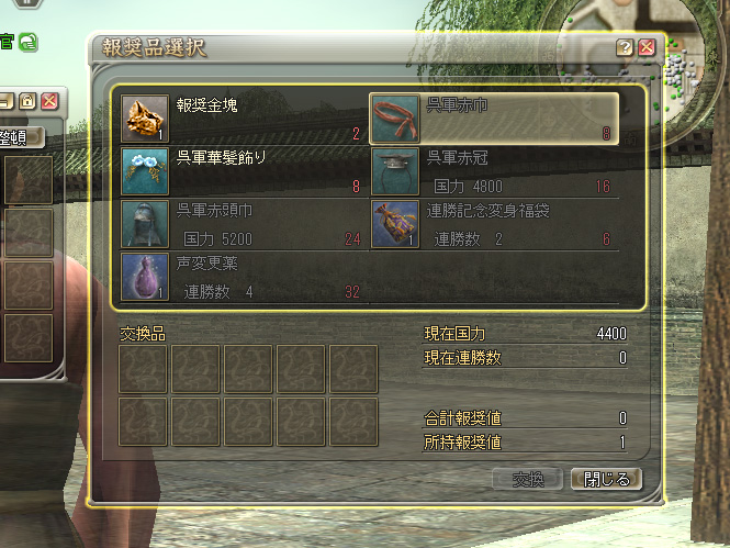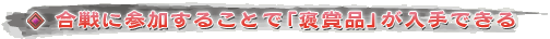 合戦に参加すると戦果に応じて「報奨値」というポイントが得られる。この褒賞値はある程度たまると「報奨品」と交換できる。報奨品には勢力専用のアイテムや,特別な外見を持つアイテムなどがある。金銭がほしい人のためには,銭に交換できるアイテムが用意されている。また報奨品には「合戦に○回連勝する」など特別な条件を満たした場合にしか交換可能にならないものもある。