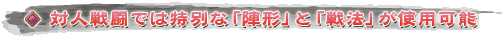 「陣形」と「戦法」は,合戦などの対人戦でしか使用できない特別なコマンドだ。対人戦のマップにおいてプレイヤー同士で連合を組むと,連合内の各徒党の党首はこれらを使用できるようになる。