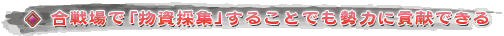 このような物資採集による合戦への貢献は,戦闘技能があまり育っていないキャラクターでも可能なので,まだプレイを始めて間もないプレイヤーや,採集や生産を中心に遊んでいるプレイヤーでも行える。普段戦力としての合戦参加をメインとしている人でも,たまに採集要員として参加してみると,いつもとは違った角度から戦闘を眺めることができて面白いかもしれない。